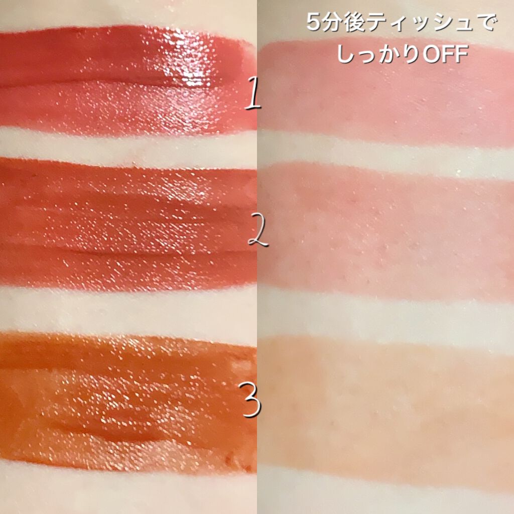 - ツヤ膜でLIPカラーを閉じ込める 塗ってから「5分」でかわいい唇完成♥ツヤがあふれ出るオイルinウォーターティント 水に対して約2倍のオイル成分を配合した「オイルinウォーター処方」 時間経過でツヤ膜がじゅわ~っとあふれ出し、 まるでグロスを重ねたような仕上がりに。みずみずしいツヤ感が持続します。 塗布後、時間経過(※)で色が定着して食べても飲んでも血色長持ち。 (※定着には個人差があります。弊社5分推奨) 高密着で唇に溶け込むように色づきます。 コップやペットボトルへの色移りがしにくくなります。