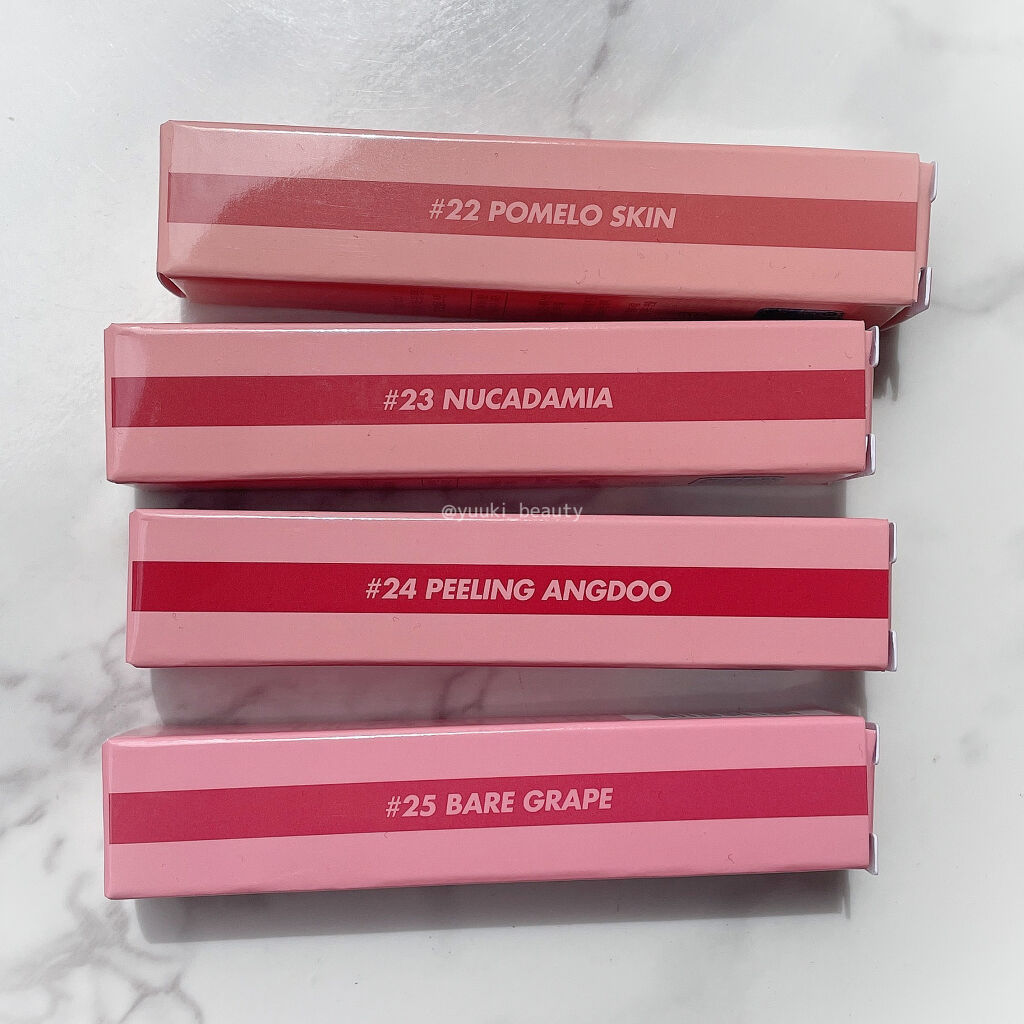 - <06 フィグフィグ(FIGFIG)> 水、オクチルドデカノール、ジメチコン、変性アルコール、アクリレーツコポリマー、ステアリン酸ソルビタン、エチルセルロース、ベヘニルアルコール、ペンチレングリコール、キウイエキス、パパイア果実エキス、グレープフルーツ果実エキス、ココヤシ果実エキス、マンゴー果実エキス、グアバ果実エキス、ポリソルベート60、シリカ、(アクリル酸Na/アクリロイルジメチルタウリンNa)コポリマー、リンゴ酸ジイソステアリル、トリイソステアリン酸ポリグリセリル-2、イソヘキサデカン、ポリソルベート80、ジイソステアリン酸ポリグリセリル-2、オレイン酸ソルビタン、エチルヘキシルグリセリン、BG、EDTA-2Na、フェノキシエタノール、香料、酸化チタン、酸化鉄、赤202、赤227、黄5、赤102、青1 <07 ジュジュブ(JUJUBE)> 水、オクチルドデカノール、ジメチコン、変性アルコール、アクリレーツコポリマー、ステアリン酸ソルビタン、エチルセルロース、ベヘニルアルコール、ペンチレングリコール、キウイエキス、パパイア果実エキス、グレープフルーツ果実エキス、ココヤシ果実エキス、マンゴー果実エキス、グアバ果実エキス、ポリソルベート60、シリカ、(アクリル酸Na/アクリロイルジメチルタウリンNa)コポリマー、トリイソステアリン酸ポリグリセリル-2、リンゴ酸ジイソステアリル、イソヘキサデカン、ポリソルベート80、ジイソステアリン酸ポリグリセリル-2、オレイン酸ソルビタン、エチルヘキシルグリセリン、BG、EDTA-2Na、フェノキシエタノール、香料、酸化チタン、酸化鉄、赤202、赤227、黄5、黄4、青1 <08 アップルブラウン(APPLE BROWN)> 水、オクチルドデカノール、ジメチコン、変性アルコール、アクリレーツコポリマー、ステアリン酸ソルビタン、エチルセルロース、ベヘニルアルコール、ペンチレングリコール、キウイエキス、パパイア果実エキス、グレープフルーツ果実エキス、ココヤシ果実エキス、マンゴー果実エキス、グアバ果実エキス、ポリソルベート60、シリカ、(アクリル酸Na/アクリロイルジメチルタウリンNa)コポリマー、トリイソステアリン酸ポリグリセリル-2、イソヘキサデカン、リンゴ酸ジイソステアリル、ポリソルベート80、ジイソステアリン酸ポリグリセリル-2、オレイン酸ソルビタン、エチルヘキシルグリセリン、BG、EDTA-2Na、フェノキシエタノール、香料、酸化鉄、黄5、赤202、酸化チタン、赤227、青1 <11 ピンクパンプキン(PINK PUMPKIN)> 水、オクチルドデカノール、ジメチコン、変性アルコール、アクリレーツコポリマー、ステアリン酸ソルビタン、エチルセルロース、ベヘニルアルコール、ペンチレングリコール、キウイエキス、パパイア果実エキス、グレープフルーツ果実エキス、ココヤシ果実エキス、マンゴー果実エキス、グアバ果実エキス、ポリソルベート60、シリカ、(アクリル酸Na/アクリロイルジメチルタウリンNa)コポリマー、リンゴ酸ジイソステアリル、イソヘキサデカン、トリイソステアリン酸ポリグリセリル-2、ポリソルベート80、ジイソステアリン酸ポリグリセリル-2、オレイン酸ソルビタン、エチルヘキシルグリセリン、BG、EDTA-2Na、フェノキシエタノール、香料、酸化チタン、酸化鉄、赤202、黄4、赤227、黄5、赤104(1) <22 ポメロスキン(POMELO SKIN)> 水、オクチルドデカノール、ジメチコン、変性アルコール、アクリレーツコポリマー、ポリソルベート60、エチルセルロース、ベヘニルアルコール、ペンチレングリコール、(アクリル酸Na/アクリロイルジメチルタウリンNa)コポリマー、シリカ、ステアリン酸ソルビタン、イソヘキサデカン、リンゴ酸ジイソステアリル、フェノキシエタノール、酸化チタン、トリイソステアリン酸ポリグリセリル-2、ポリソルベート80、酸化鉄、香料、オレイン酸ソルビタン、エチレンジアミンジコハク酸3Na、エチルヘキシルグリセリン、赤202、ジイソステアリン酸ポリグリセリル-2、赤227、黄5、青1、BG、キウイエキス、パパイア果実エキス、グレープフルーツ果実エキス、ココヤシ果実、マンゴー果実エキス、グアバ果実エキス <23 ヌカダミア(NUCADAMIA)> 水、オクチルドデカノール、ジメチコン、変性アルコール、アクリレーツコポリマー、ポリソルベート60、エチルセルロース、ベヘニルアルコール、ペンチレングリコール、(アクリル酸Na/アクリロイルジメチルタウリンNa)コポリマー、シリカ、ステアリン酸ソルビタン、イソヘキサデカン、フェノキシエタノール、リンゴ酸ジイソステアリル、酸化チタン、ポリソルベート80、トリイソステアリン酸ポリグリセリル-2、酸化鉄、香料、オレイン酸ソルビタン、エチレンジアミンジコハク酸3Na、赤202、赤227、黄5、ジイソステアリン酸ポリグリセリル-2、エチルヘキシルグリセリン、黄4、青1、BG、キウイエキス、パパイア果実エキス、グレープフルーツ果実エキス、ココヤシ果実、マンゴー果実エキス <24 ピーリングエンドゥ(PEELING ANGDOO)> 水、オクチルドデカノール、ジメチコン、変性アル