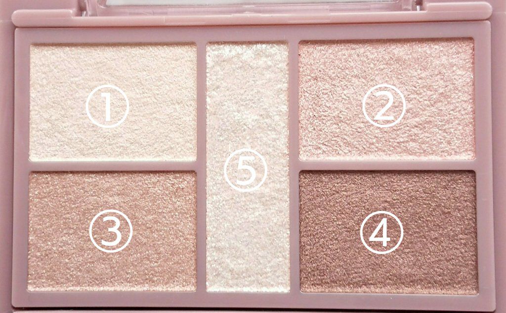 - 1枚のパレットで2つのスタイルが完成! 5色の欲ばりアイシャドウ♥ メインカラーを選んで2つのスタイルが楽しめる! A→B→D でスタイル1 A→C→D でスタイル2 繊細な粉質が、しっとりとまぶたに密着して色落ちを防ぎます。 透明感のあるキラうるトッピングジュエル(繊細ラメ)は、気分によってトッピング!