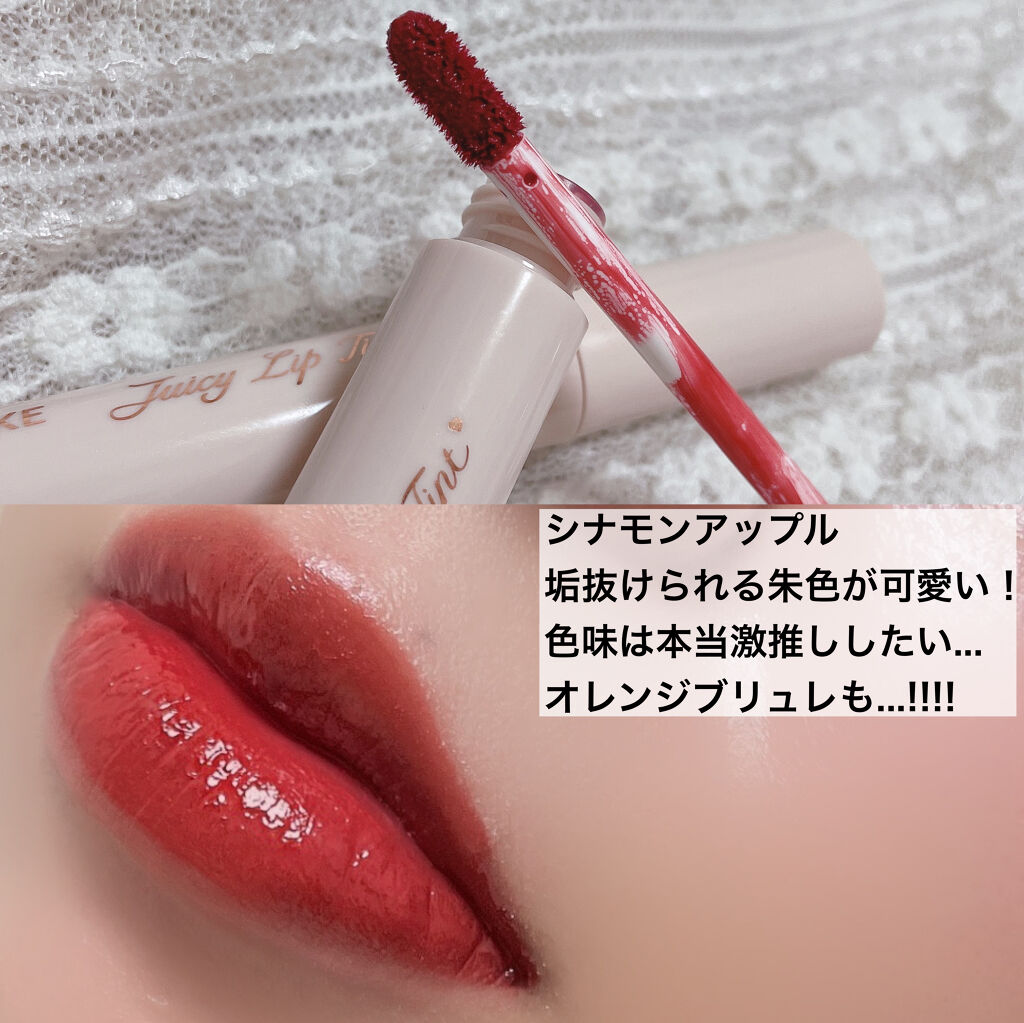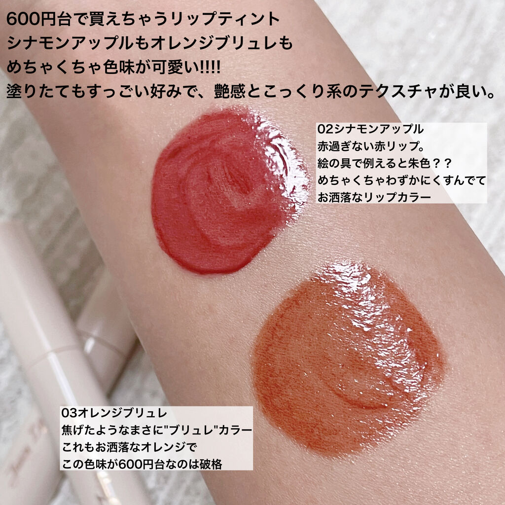 - ツヤ膜でLIPカラーを閉じ込める 塗ってから「5分」でかわいい唇完成♥ツヤがあふれ出るオイルinウォーターティント 水に対して約2倍のオイル成分を配合した「オイルinウォーター処方」 時間経過でツヤ膜がじゅわ~っとあふれ出し、 まるでグロスを重ねたような仕上がりに。みずみずしいツヤ感が持続します。 塗布後、時間経過(※)で色が定着して食べても飲んでも血色長持ち。 (※定着には個人差があります。弊社5分推奨) 高密着で唇に溶け込むように色づきます。 コップやペットボトルへの色移りがしにくくなります。