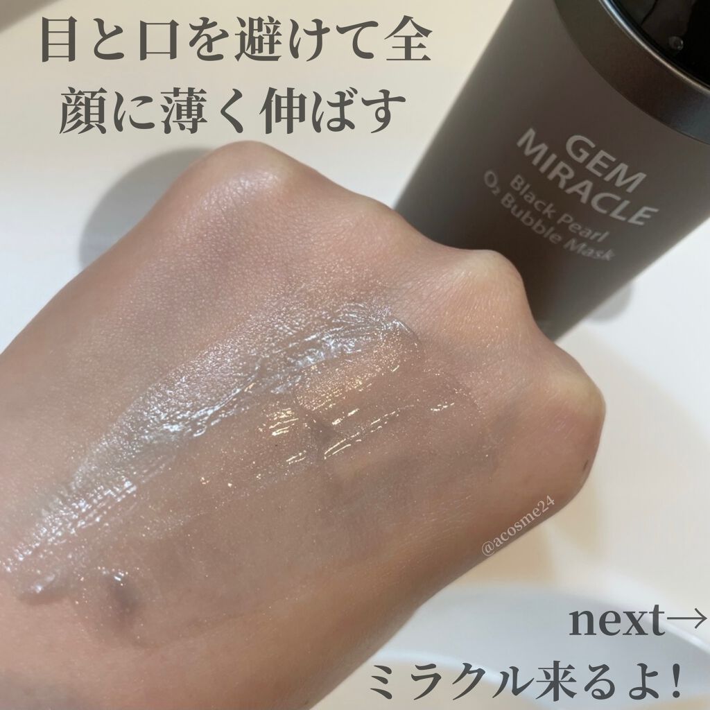 - 真珠のように輝くツヤ玉肌を手に入れるため誕生したのが、ジェムミラクルブラックパールO₂バブルマスクです。 “毛穴汚れ”を酸素の泡とタヒチ産ブラックパールで洗い流し、どの角度から見てもつるんとした真珠のようなお肌へと導くスペシャルケアアイテムです。 5in1の働きでより一層澄んだ素肌へ 肌の汚れ除去・角質除去・肌を整える・肌の引き締め・肌の洗浄 の5つの効果。空気中の酸素と結合し、超微細な酸素泡がシュワシュワっと浮き出ながら、お肌に数万個の膜をつくります。パックしている間、保湿成分の角質層までの浸透を助け、澄んだ印象の素肌へと導きます。 ・タヒチ産黒真珠エキス 品質の高いタヒチ産の天然黒真珠から抽出したアミノ酸成分が皮膚に潤いを与え、健やかな肌へと導きます。 ・真珠パウダー 細やかな天然真珠パウダーが肌にツヤを与え、表情を明るく演出してくれます。 ・酸素キャリア 酸素を運ぶフッ素化合物が酸素バブルを形成し、皮脂や汚れを除去します。皮膚の汚れを取り除くことでくすんだ印象を明るくケアします。 ・ギガホワイト 7種類のハーブが古い角質を除去し、透明感のある印象へと近づけます。 ・パパイヤエキス 天然酵素エンザイムを含有するパパイヤエキスが角質層を柔らかくし、なめらかな肌へと整えます。