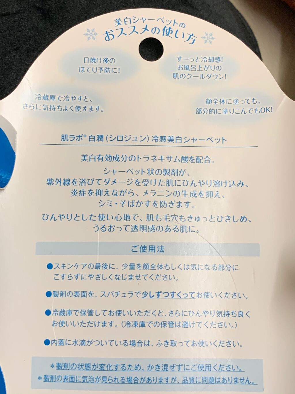 肌ラボ白潤冷感美白シャーベットこちらの商品は、昨年の夏にも購入しました😊手のひらサイズで、付属の小さなスパチュラで、削り取るようにして使います❣️冷蔵庫に冷やしおくと、ほんとシャーベットみたいな削り心地と冷たさが味わえます❄️私は、お風呂上が...