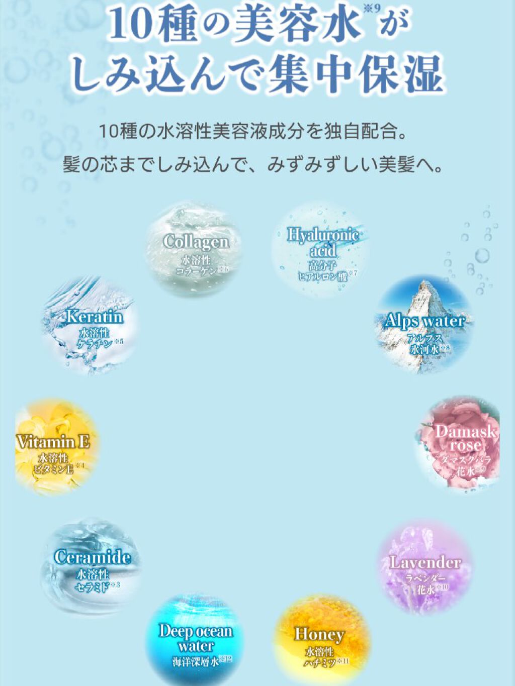 - <シャンプー 340ml> 水、ラウラミドプロピルベタイン、オレフィン(C14-16)スルホン酸Na、コカミドプロピルベタイン、グリセリン、コカミドメチルMEA、ラウロイルメチルアラニンNa、ヒアルロン酸Na、カルボキシメチルヒアルロン酸Na、加水分解ヒアルロン酸、水溶性コラーゲン、グルコシルセラミド、加水分解ハチミツタンパク、ベルガモット果実油、アルガニアスピノサ核油、ダマスクバラ花水、ラベンダー花水、サトウカエデ樹液、トコフェリルリン酸Na、ポリクオタニウム-47、ポリクオタニウム-10、ココイルグルタミン酸TEA、キシリチルグルコシド、塩化Na、炭酸Ca、アスコフィルムノドスムエキス、レシチン、ソルビン酸K、水酸化K、α-グルカン、ジエチルアミノヒドロキシベンゾイル安息香酸ヘキシル、メトキシケイヒ酸エチルヘキシル、クエン酸、EDTA-2Na、PPG-7、フェノキシエタノール、ミリスチルベタイン、安息香酸Na、キシリトール、BG、エタノール、ソルビトール、無水キシリトール、メントール、海水、海塩、香料、黄4、赤227、青1 <トリートメント 335g> 水、ラウラミドプロピルベタイン、オレフィン(C14-16)スルホン酸Na、コカミドプロピルベタイン、グリセリン、コカミドメチルMEA、ラウロイルメチルアラニンNa、ヒアルロン酸Na、カルボキシメチルヒアルロン酸Na、加水分解ヒアルロン酸、水溶性コラーゲン、グルコシルセラミド、加水分解ハチミツタンパク、ベルガモット果実油、アルガニアスピノサ核油、ダマスクバラ花水、ラベンダー花水、サトウカエデ樹液、トコフェリルリン酸Na、ポリクオタニウム-47、ポリクオタニウム-10、ココイルグルタミン酸TEA、キシリチルグルコシド、塩化Na、炭酸Ca、アスコフィルムノドスムエキス、レシチン、ソルビン酸K、水酸化K、α-グルカン、ジエチルアミノヒドロキシベンゾイル安息香酸ヘキシル、メトキシケイヒ酸エチルヘキシル、クエン酸、EDTA-2Na、PPG-7、フェノキシエタノール、ミリスチルベタイン、安息香酸Na、キシリトール、BG、エタノール、ソルビトール、無水キシリトール、メントール、海水、海塩、香料、黄4、赤227、青1 <詰替え用シャンプー 280ml> 水、ラウラミドプロピルベタイン、オレフィン(C14-16)スルホン酸Na、コカミドプロピルベタイン、グリセリン、コカミドメチルMEA、ラウロイルメチルアラニンNa、ヒアルロン酸Na、カルボキシメチルヒアルロン酸Na、加水分解ヒアルロン酸、水溶性コラーゲン、グルコシルセラミド、加水分解ハチミツタンパク、ベルガモット果実油、アルガニアスピノサ核油、ダマスクバラ花水、ラベンダー花水、サトウカエデ樹液、トコフェリルリン酸Na、ポリクオタニウム-47、ポリクオタニウム-10、ココイルグルタミン酸TEA、キシリチルグルコシド、塩化Na、炭酸Ca、アスコフィルムノドスムエキス、レシチン、ソルビン酸K、水酸化K、α-グルカン、ジエチルアミノヒドロキシベンゾイル安息香酸ヘキシル、メトキシケイヒ酸エチルヘキシル、クエン酸、EDTA-2Na、PPG-7、フェノキシエタノール、ミリスチルベタイン、安息香酸Na、キシリトール、BG、エタノール、ソルビトール、無水キシリトール、メントール、海水、海塩、香料、黄4、赤227、青1 <詰替え用トリートメント 280g> 水、セタノール、セテアリルアルコール、ジメチコン、ベヘントリモニウムクロリド、グリセリン、トリエチルヘキサノイン、アモジメチコン、水溶性コラーゲン、グルコシルセラミド、加水分解ハチミツタンパク、加水分解ハトムギ種子、カルボキシメチルヒアルロン酸Na、ラベンダー花水、ダマスクバラ花水、エーデルワイス花/葉エキス、レシチン、アミノプロピルジメチコン、クエン酸、ヒドロキシエチルセルロース、トコフェリルリン酸Na、α-グルカン、アスコフィルムノドスムエキス、サトウカエデ樹液、ペンテト酸5Na、クエン酸Na、安息香酸Na、温泉水、ソルビン酸K、黄4、BG、エタノール、ジメチコノール、青1、ソルビトール、海水、海塩、フェノキシエタノール、香料