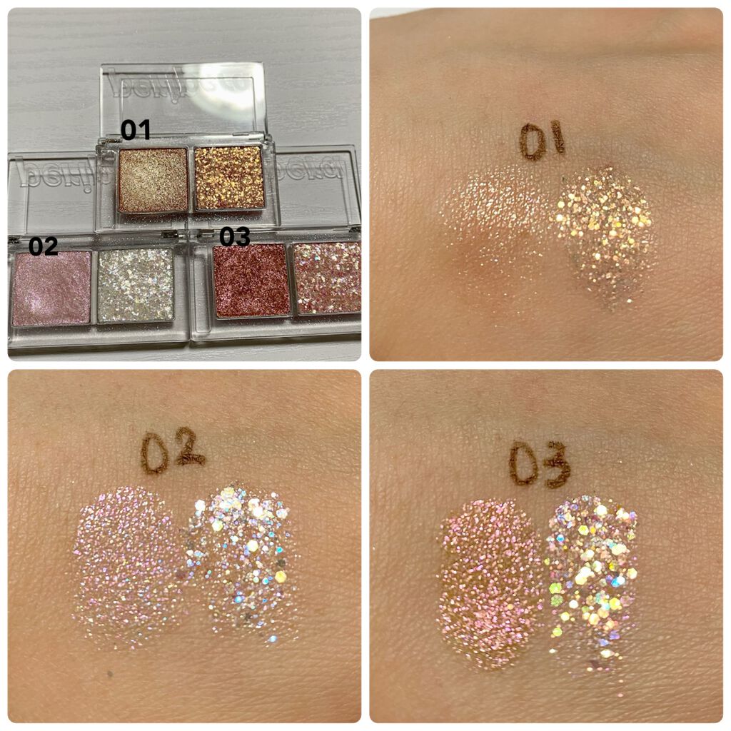 プチプラ韓国アイシャドウレビューPERIPERAデュオポケットグリッターシャドウ01、02、03しっとりギラギラシャドウ✨ラメ好きにはたまらないコスメです!◎グリッターに関してはジェルのようなしっとり質感でピタッと密着◎細かいグリッターもしっ...