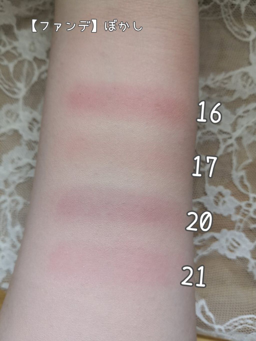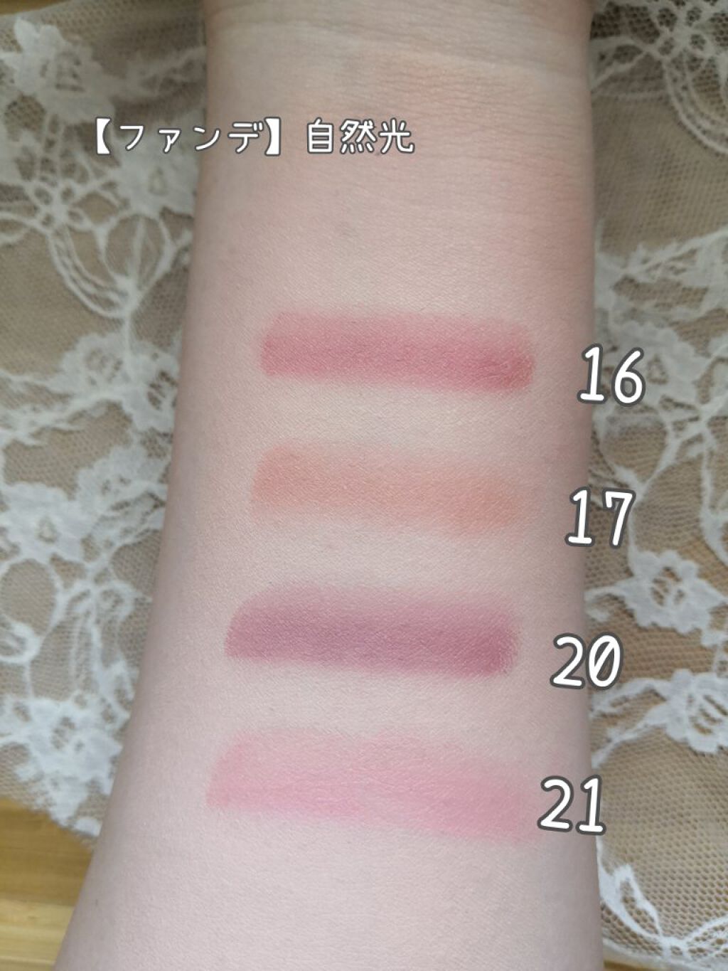 - <05 スウィートアプリコット> イソノナン酸イソトリデシル、スクワラン、ジメチコン、パルミチン酸デキストリン、トリイソステアリン酸ポリグリセリル-2、メタクリル酸メチルクロスポリマー、(ビニルジメチコン/メチコンシルセスキオキサン)クロスポリマー、セスキイソステアリン酸ソルビタン、(ジメチコン/ビニルジメチコン)クロスポリマー、リンゴ酸ジイソステアリル、ジメチルシリル化シリカ、トコフェロール、ラウロイルグルタミン酸ジ(フィトステリル/オクチルドデシル)、ホウケイ酸(Ca/Al)、酸化チタン、マイカ、タルク、シリカ、黄4、赤201、赤202、硫酸Ba、水酸化Al、橙201、ハイドロゲンジメチコン、酸化鉄 <16 アーモンドテラコッタ> イソノナン酸イソトリデシル、スクワラン、ジメチコン、パルミチン酸デキストリン、メタクリル酸メチルクロスポリマー、トリイソステアリン酸ポリグリセリル-2、(ビニルジメチコン/メチコンシルセスキオキサン)クロスポリマー、セスキイソステアリン酸ソルビタン、(ジメチコン/ビニルジメチコン)クロスポリマー、ジメチルシリル化シリカ、トコフェロール、ラウロイルグルタミン酸ジ(フィトステリル/オクチルドデシル)、ハイドロゲンジメチコン、アルミナ、ホウケイ酸(Ca/Al)、酸化鉄、タルク、酸化チタン、シリカ、黄4、赤201、赤202、硫酸Ba <21 タンジェリンティー> イソノナン酸イソトリデシル、スクワラン、ジメチコン、パルミチン酸デキストリン、メタクリル酸メチルクロスポリマー、トリイソステアリン酸ポリグリセリル-2、(ビニルジメチコン/メチコンシルセスキオキサン)クロスポリマー、セスキイソステアリン酸ソルビタン、(ジメチコン/ビニルジメチコン)クロスポリマー、ジメチルシリル化シリカ、トコフェロール、ラウロイルグルタミン酸ジ(フィトステリル/オクチルドデシル)、ハイドロゲンジメチコン、ホウケイ酸(Ca/Al)、タルク、酸化チタン、黄4、酸化鉄、シリカ、赤201、水酸化Al、赤202、硫酸Ba <23 キューピッドピンク> イソノナン酸イソトリデシル、スクワラン、ジメチコン、パルミチン酸デキストリン、メタクリル酸メチルクロスポリマー、トリイソステアリン酸ポリグリセリル-2、(ビニルジメチコン/メチコンシルセスキオキサン)クロスポリマー、セスキイソステアリン酸ソルビタン、(ジメチコン/ビニルジメチコン)クロスポリマー、ジメチルシリル化シリカ、トコフェロール、ラウロイルグルタミン酸ジ(フィトステリル/オクチルドデシル)、ハイドロゲンジメチコン、ホウケイ酸(Ca/Al)、酸化チタン、タルク、シリカ、水酸化Al、酸化鉄、赤202、硫酸Ba、黄4、赤201 <19 シナモンミルクティー> イソノナン酸イソトリデシル、スクワラン、ジメチコン、パルミチン酸デキストリン、メタクリル酸メチルクロスポリマー、トリイソステアリン酸ポリグリセリル-2、(ビニルジメチコン/メチコンシルセスキオキサン)クロスポリマー、セスキイソステアリン酸ソルビタン、(ジメチコン/ビニルジメチコン)クロスポリマー、ジメチルシリル化シリカ、トコフェロール、ラウロイルグルタミン酸ジ(フィトステリル/オクチルドデシル)、ハイドロゲンジメチコン、ホウケイ酸(Ca/Al)、タルク、酸化チタン、酸化鉄、シリカ、黄4、水酸化Al