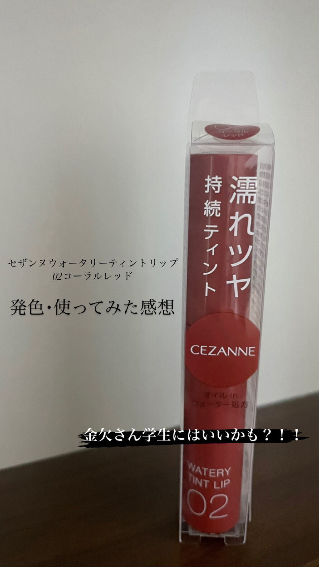- ツヤ×色×潤いをキープする、セザンヌの新濡れツヤリップ みずみずしい濡れツヤ感ある仕上がりで、発色とツヤが長続きするティントリップです。ティントの発色を透明のベールで覆うリップコートのような処方で、ツヤ感と色をキープします。さらに、唇表面のべたつきは少なく、しっとり潤うオイルinウォーター処方を採用しています。