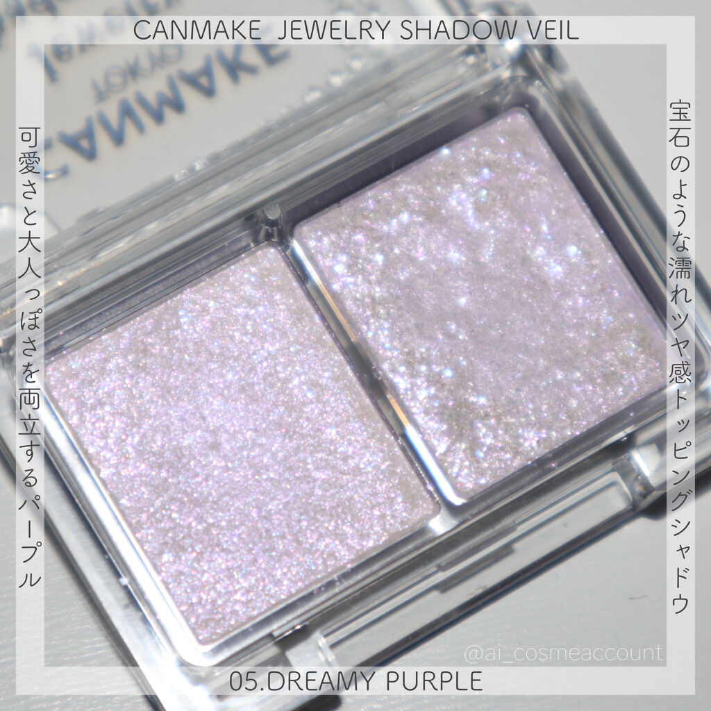 キャンメイク ジュエリーシャドウベール05ドリーミーパープルキラキラ感を足したい時のラメのせ専用アイシャドウ【使ってみた感想】・2種類のラメを使い分けられる・ラメ感がスゴイ・コスパがいい・パープルはブルベに合う思ったよりラメ感が強い。ほんのり...