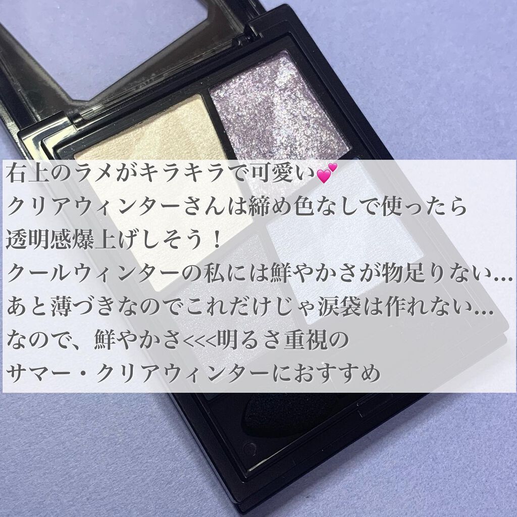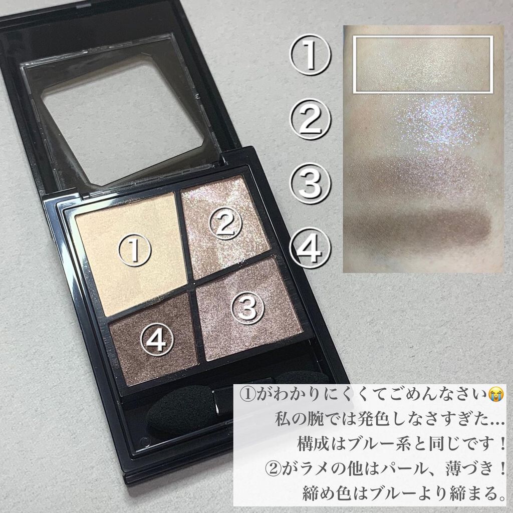 ブルベ向けシャドウしてよく紹介されているこちら使ってみた 全体的に薄めの発色・濃さが欲しいので、右下は指塗りすることが多い 色味が派手でないので、オフィスメイクに使える