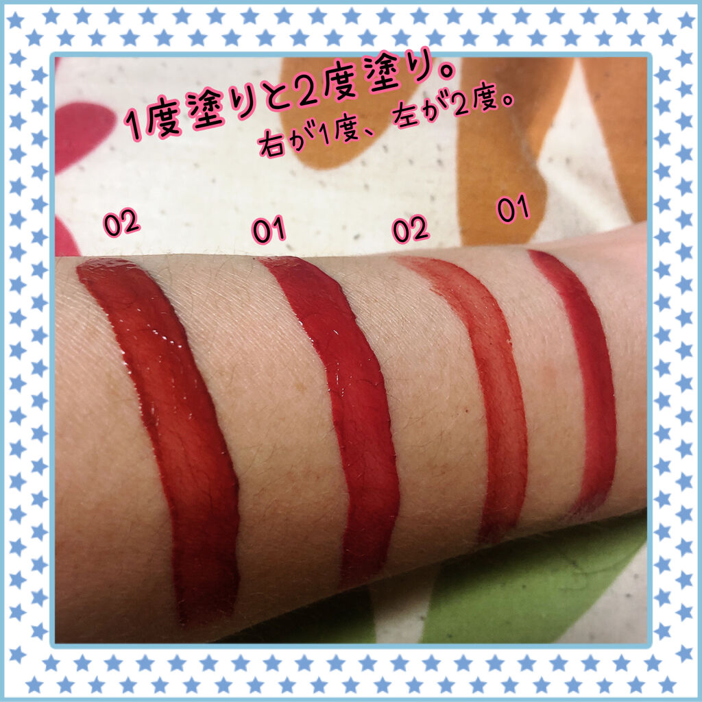 - ツヤ膜でLIPカラーを閉じ込める 塗ってから「5分」でかわいい唇完成♥ツヤがあふれ出るオイルinウォーターティント 水に対して約2倍のオイル成分を配合した「オイルinウォーター処方」 時間経過でツヤ膜がじゅわ~っとあふれ出し、 まるでグロスを重ねたような仕上がりに。みずみずしいツヤ感が持続します。 塗布後、時間経過(※)で色が定着して食べても飲んでも血色長持ち。 (※定着には個人差があります。弊社5分推奨) 高密着で唇に溶け込むように色づきます。 コップやペットボトルへの色移りがしにくくなります。