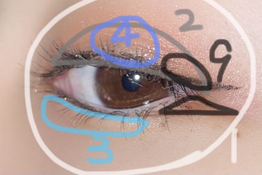 片目奥二重、片目二重なので、違うメイクで…(もう、ある意味半顔メイク)二重の方は濃くキラキラに重ねていくイメージで!奥二重の方は目尻に濃ゆい色を入れてパキッとキラキラは最小限?のイメージで!赤の所はrom&ndの右下の1番濃ゆい色。...