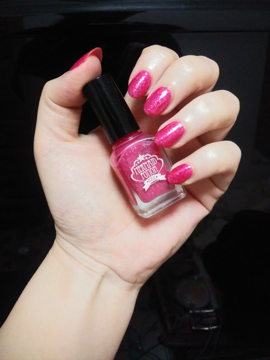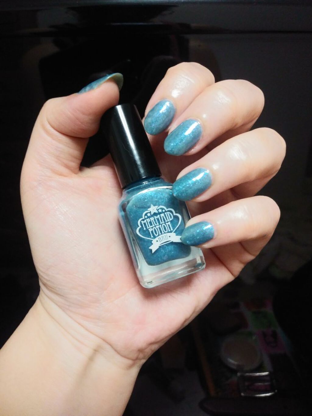 キャンドゥの新作ポリッシュです🙌小さなオーロラホロが入っていて、発色は薄づきで、4度塗りしました。1度塗りだと、血色の悪い爪みたいになってしまいます😅ハッキリした発色の黒って、挑戦しにくいので、このマーメイドポーションネイルの透明感のある感じ...