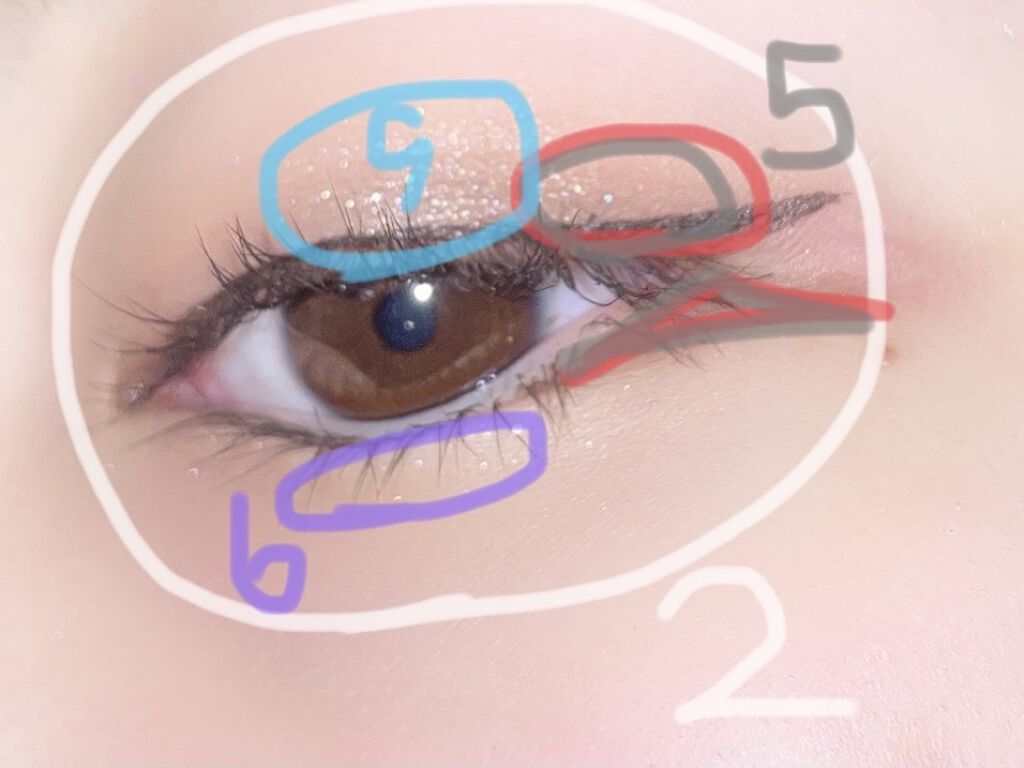 片目奥二重、片目二重なので、違うメイクで…(もう、ある意味半顔メイク)二重の方は濃くキラキラに重ねていくイメージで!奥二重の方は目尻に濃ゆい色を入れてパキッとキラキラは最小限?のイメージで!赤の所はrom&ndの右下の1番濃ゆい色。...