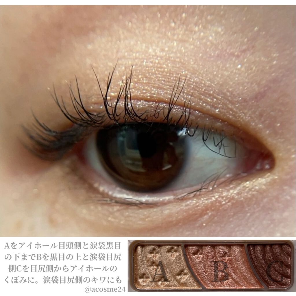 - 3色で簡単に明るく大きな目元に。 しっとり感触のアイシャドウ。 くすみを飛ばす明るさベース、ひとえ・奥二重の方でも幅広く塗れる肌なじみの良い中間色、 濃密高発色の締め色が目の輪郭を強調し大きな目元に。 微細パール配合でくすみを飛ばし、明るい目元へ。