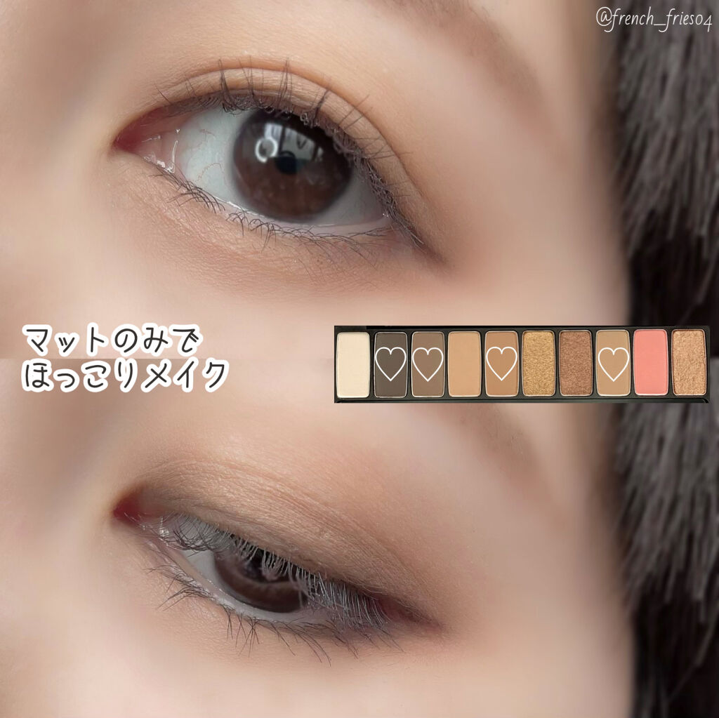 - 肌なじみの良い、鮮やかな発色で目元を華やかに彩る捨て色なしの10色アイシャドウパレット 異なる3種のテクスチャーを自由に組み合わせて、グラデーションも思いのままに。 NEW 2023.4 ・肌トーンにあう配色を詰め込んだトレンドカラー 肌トーンに合わせて、自分に似合うトレンドカラーが楽しめる♡ パーソナルカラー×トレンドカラーの掛け合わせパレットで、デイリーメイクもスペシャルメイクも気分にあわせてなりたい自分に! ・むにゅっとジェル質感ラメで高密着、煌めく目元 パレットの中でもポイントとなる大きめ粒子のラメは、ジェルのような新質感で落ちにくく肌にぴったりと密着します。キラキラとした目元をキープします。 ・使うカラーは大きめに!リアル捨て色なしパレット ベースやラメのよく使うカラーと締め色や濃い色等の減りが少ないカラーを異なるサイズで詰め込んだ、リアル捨て色なしパレット! <使用方法> 付属のデュアルシャドウブラシでベースカラーをまぶた全体に塗り広げます。細いブラシでグラデーションや目尻、アイライン、涙袋などのポイントカラーをのせて仕上げます。