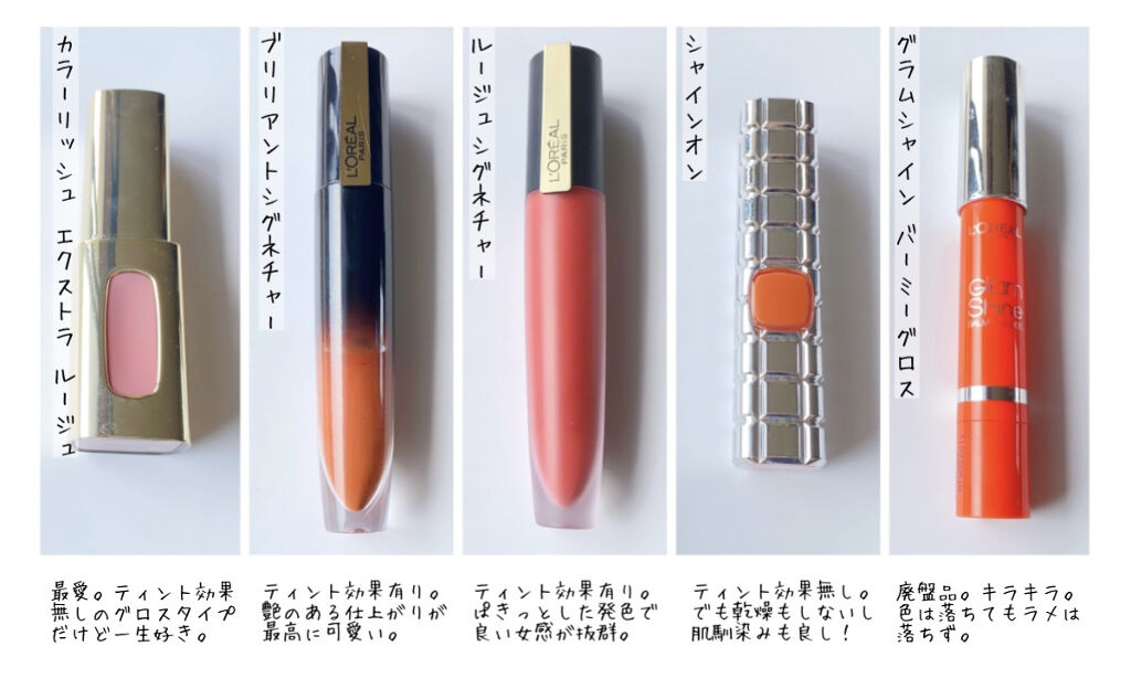 ロレアルパリのコスメティック部門が日本卒業という事で、手持ちのリップをまとめてみました。以下5種!*カラーリッシュエクストラルージュ*ブリリアントシグネチャー*ルージュシグネチャー*シャインオン*グラムシャインバーミーグロス使用期限が怖くても...