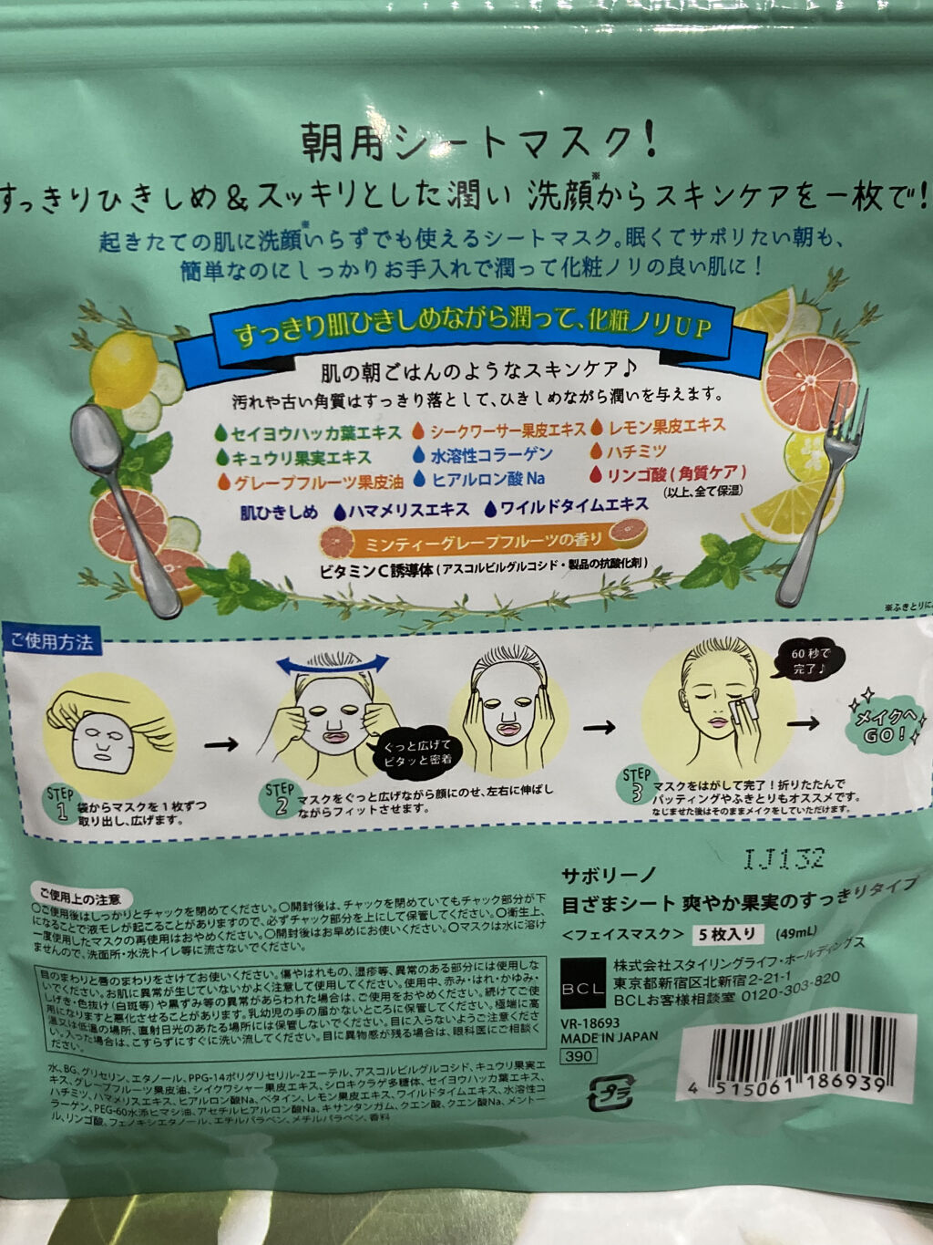 - <32枚入> 水、BG、グリセリン、エタノール、PPG-14ポリグリセリル-2エーテル、アスコルビルグルコシド、キュウリ果実エキス、グレープフルーツ果皮油、シイクワシャー果皮エキス、シロキクラゲ多糖体、セイヨウハッカ葉エキス、ハチミツ、ハマメリスエキス、ヒアルロン酸Na、ベタイン、レモン果皮エキス、ワイルドタイムエキス、水溶性コラーゲン、PEG-60水添ヒマシ油、アセチルヒアルロン酸Na、キサンタンガム、クエン酸、クエン酸Na、メントール、リンゴ酸、フェノキシエタノール、エチルパラベン、メチルパラベン、香料 <5枚入> 水、BG、グリセリン、エタノール、PPG-14ポリグリセリル-2エーテル、アスコルビルグルコシド、キュウリ果実エキス、グレープフルーツ果皮油、シイクワシャー果皮エキス、シロキクラゲ多糖体、セイヨウハッカ葉エキス、ハチミツ、ハマメリスエキス、ヒアルロン酸Na、ベタイン、レモン果皮エキス、ワイルドタイムエキス、水溶性コラーゲン、PEG-60水添ヒマシ油、アセチルヒアルロン酸Na、キサンタンガム、クエン酸、クエン酸Na、メントール、リンゴ酸、フェノキシエタノール、エチルパラベン、メチルパラベン、香料