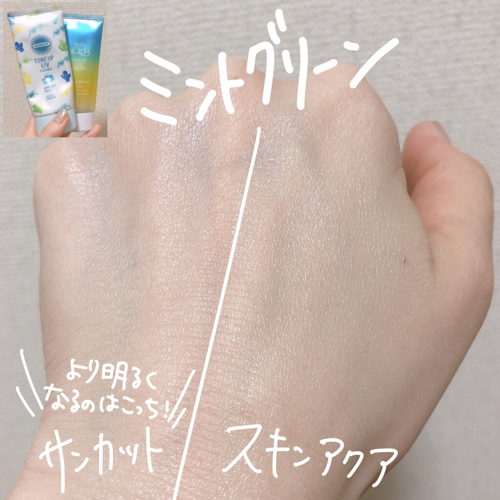 ・サンカット®トーンアップUVエッセンスミントグリーンパケがかわいいから気になっていたサンカットの日焼け止めはミントグリーンを選んでみました☺わたしは日焼け止めは兼下地になるものが良くて、これは化粧下地にもなるし顔、からだ用なのでとてもありが...