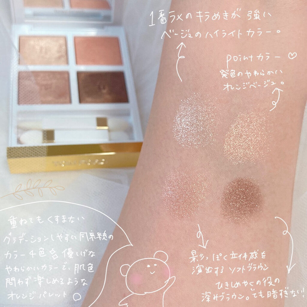 左上はマットベージュ、右上はラメ入り モーブピンク、左下はマーブル(ラメの 色は白っぽく発色する気がします)、 右下は締め色のまろやかなブラウン。 マットの粉質がふんわりしていて 簡単にぼかせるし、ラメは繊細な 輝きで大人でも派手になりすぎず 上品に見せてくれるところがさすがの SUQQU様☺️🫧 通年通して使える色味だし、 春になったら右上のモーブピンクを 強めにいれることで春メイクらしさも 楽しめそうだなと思います🤍