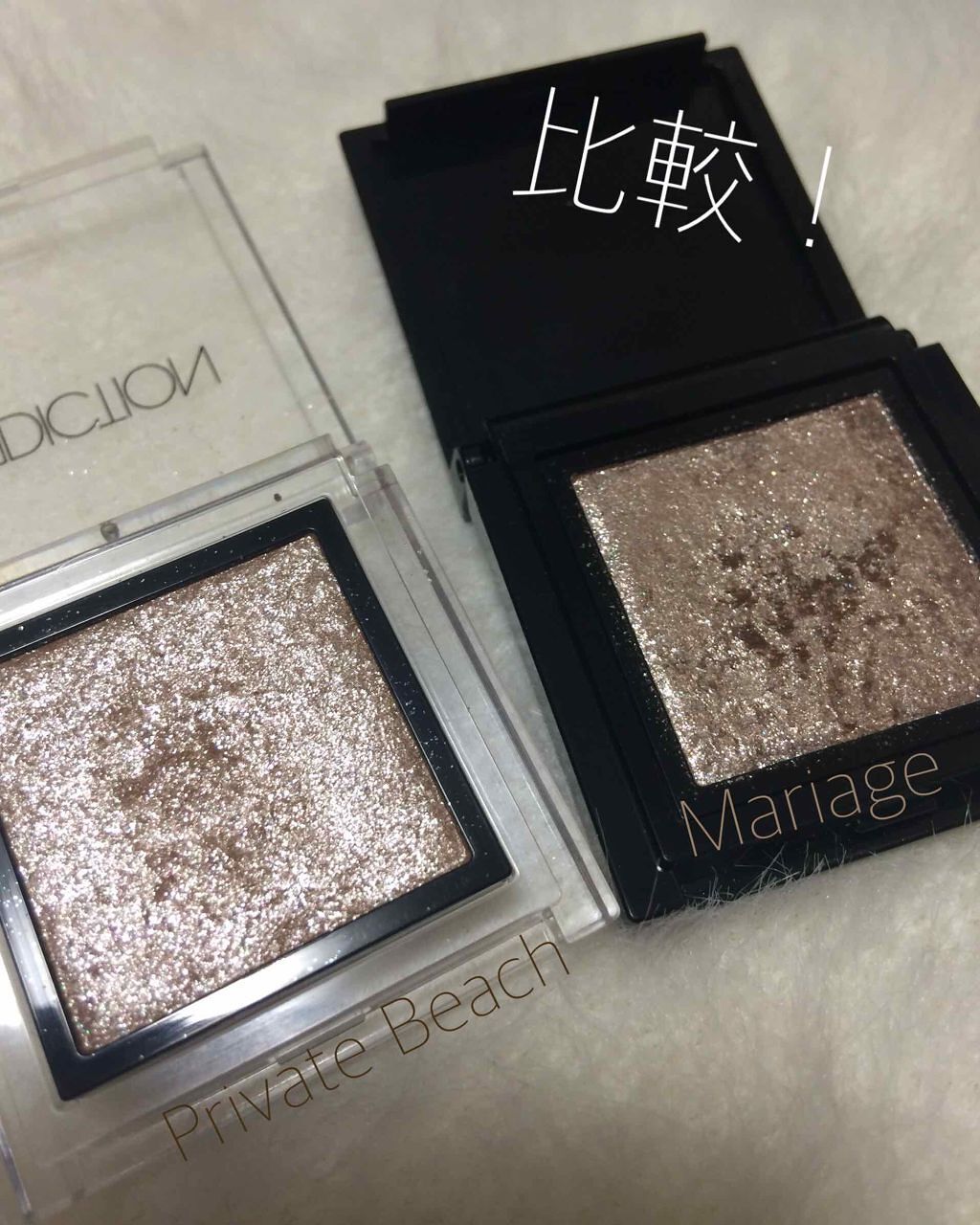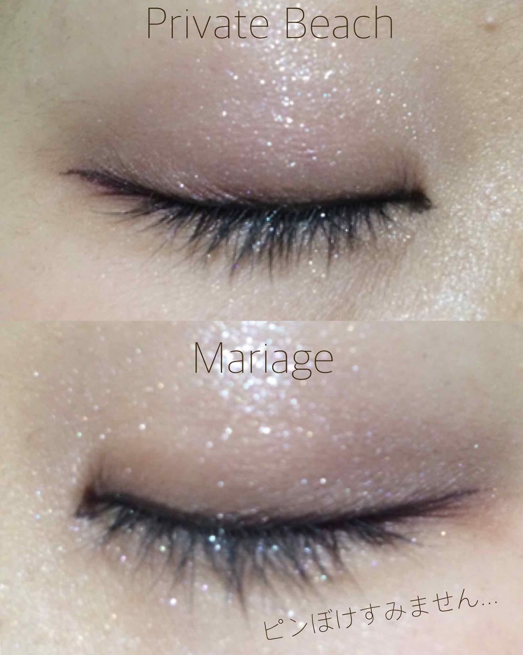 マリアージュはやっぱりスパークルだね! 面で光るし多色ラメ。 プライベートビーチは個人的にスパークルで良かったんじゃない?って思ってたけどスウォッチ並べたらパールタイプだったわ。 このふたつ、私には欠かせないアイシャドウです。