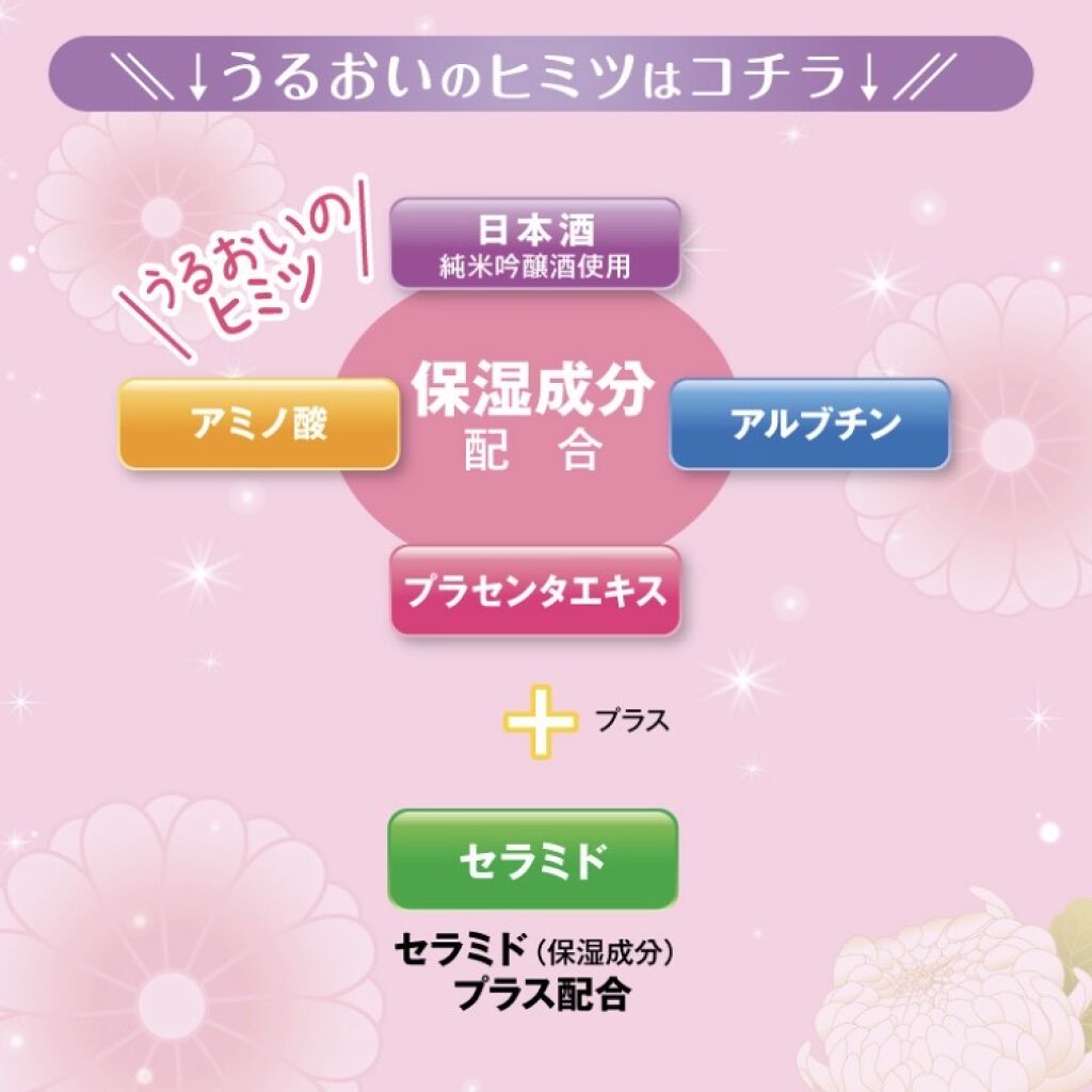 - ■うるおいを与えて肌の状態を整える日本酒(コメ発酵液・保湿成分)配合の化粧水。 ■保湿成分アミノ酸(グルタミン酸・アルギニン・ロイシン)とセラミドをさらにプラス。※菊正宗の純米吟醸酒を配合 ■とろみのある液がかさつきや乾燥が気になる部分にすーっとなじみ、肌荒れを防いでしっとりもちもちの素肌に導きます。 ■顔はもちろん、全身用ローションとしてシャワー後やお風呂上りにたっぷりとお使いください。 ■弱酸性・無着色・無鉱物油