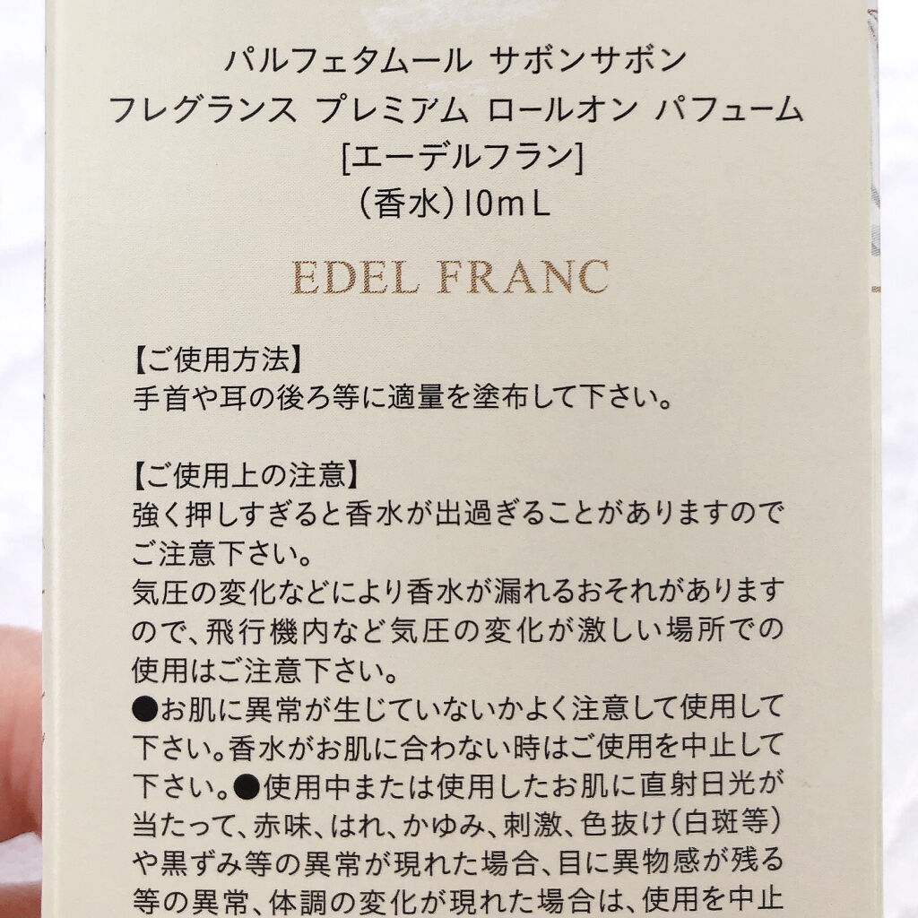 パルフェタムールサボンサボンフレグランスプレミアムロールオンパフューム エーデルフラン細身で直接塗れるロールオンタイプのパフューム。フローラルブーケとグリーンのシックな香りです。ふわっと香っていい香りです。フレグランス水分ハンドクリーム ...
