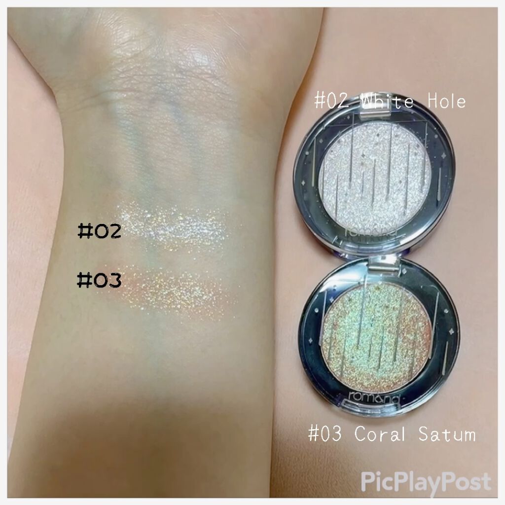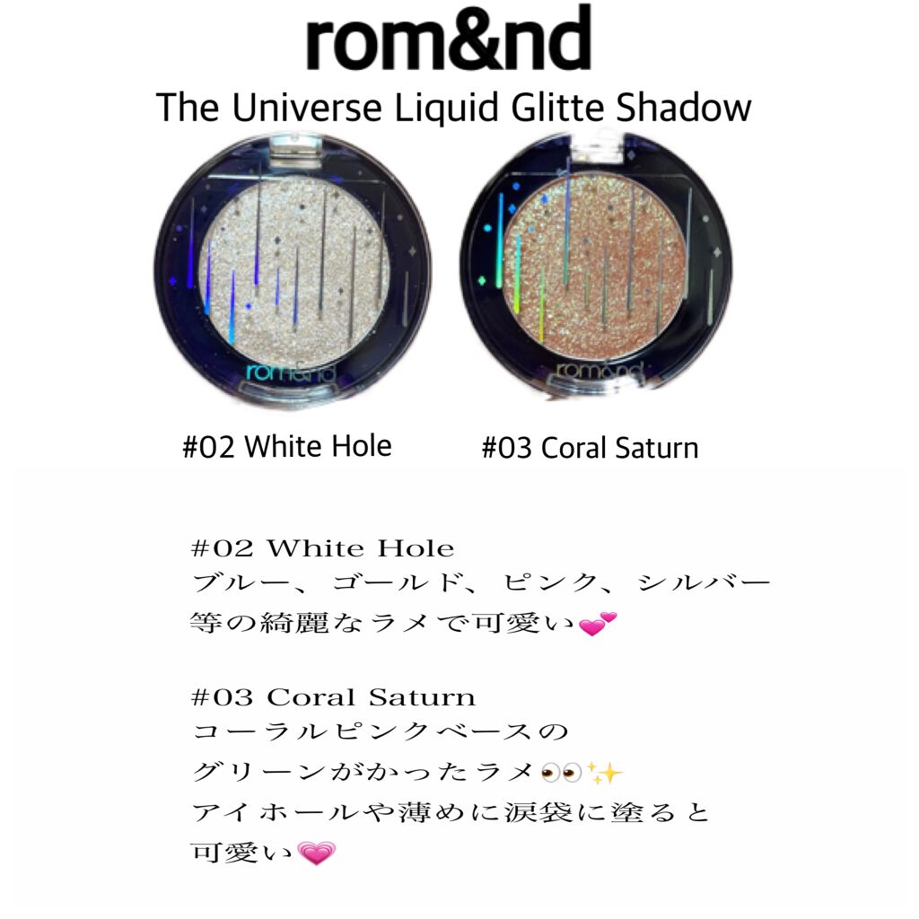 重ね付け・涙袋にもおすすめ💖rom&ndザユニバースグリッターシャドウ02ホワイトホール¥1,100(税込)ほんのりピンクみたいな可愛い見た目をしてるんだけど、まぶたに付けるとシルバー系の煌めきを見せてくれて、とっても爽やか✨こんなにラメがぎ...