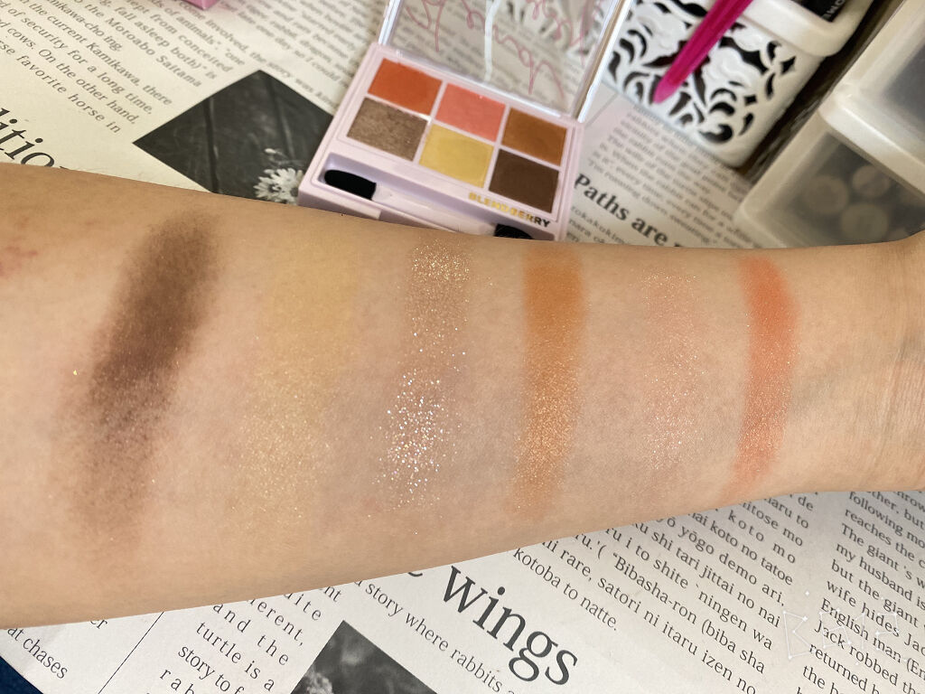 マットだけどどこかツヤ感もあるような柔らかい粉質……なのに粉飛びも少なめなので 瞼に乗せやすい🥰 5番のラメ感は控えめ。 シャンパンカラーに多色ラメがチラッ|˙꒳˙)✨ 実はこの番号通りにカラーを使うとプロ並みのメイクが完成するらしいです……‼️ ケースも薄くてコンパクトなのにベースカラー、ラメ、締め色、チークまで付いてるので 持ち運びやいつか行けるようになるであろう旅行などにも良さそうです❣️
