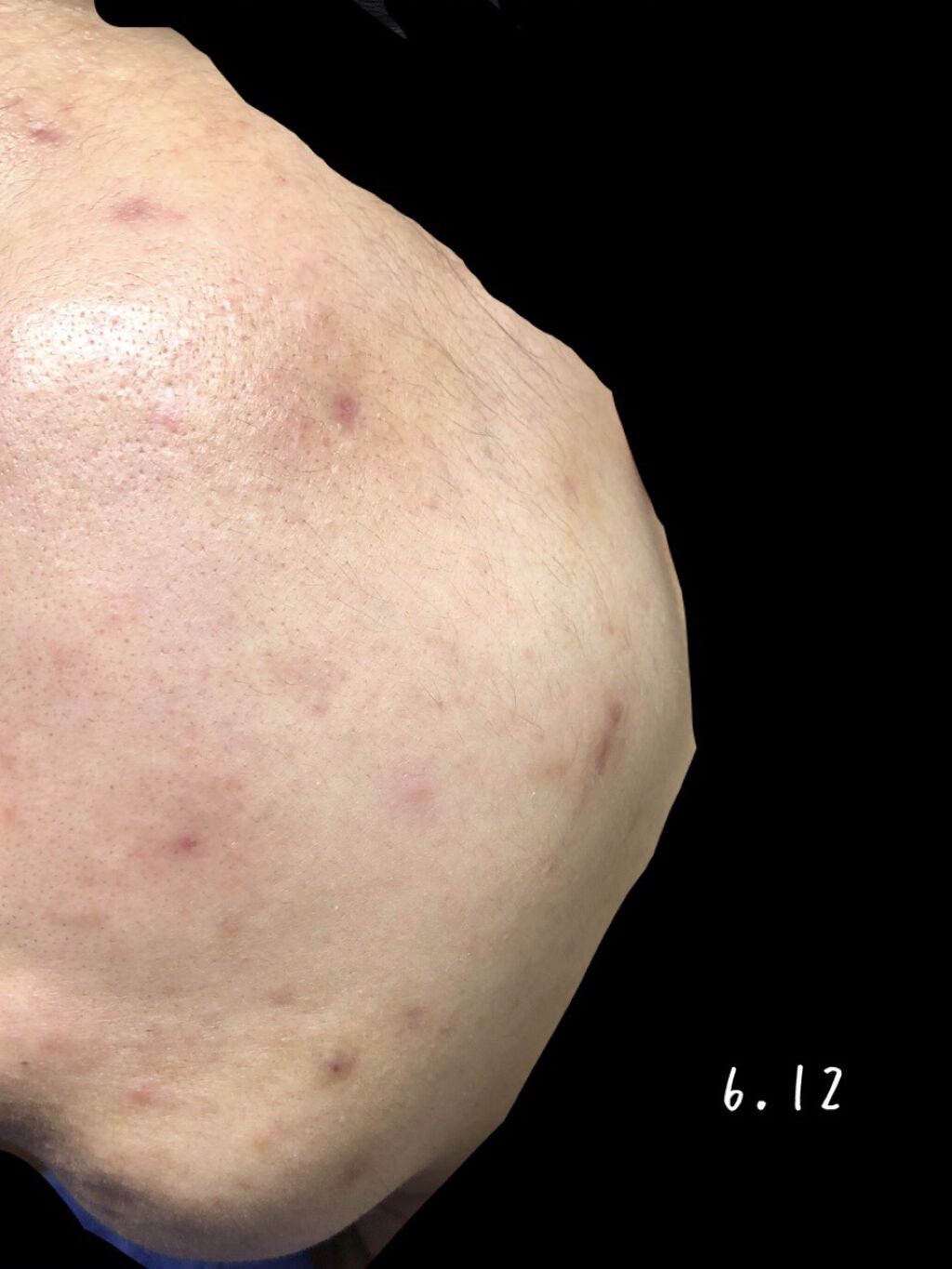 1.3枚目は6月16日2.4枚目は今日6月19日の写真ですニキビちゃっかり大きくなってて笑う先週の土曜くらいからかぶれ始めてて、かゆみぶつぶつだけでなくマスクで擦れて痛みまで酷くなってきたので昨日皮膚科行ってロコイド軟膏を貰ってきました。(遅...