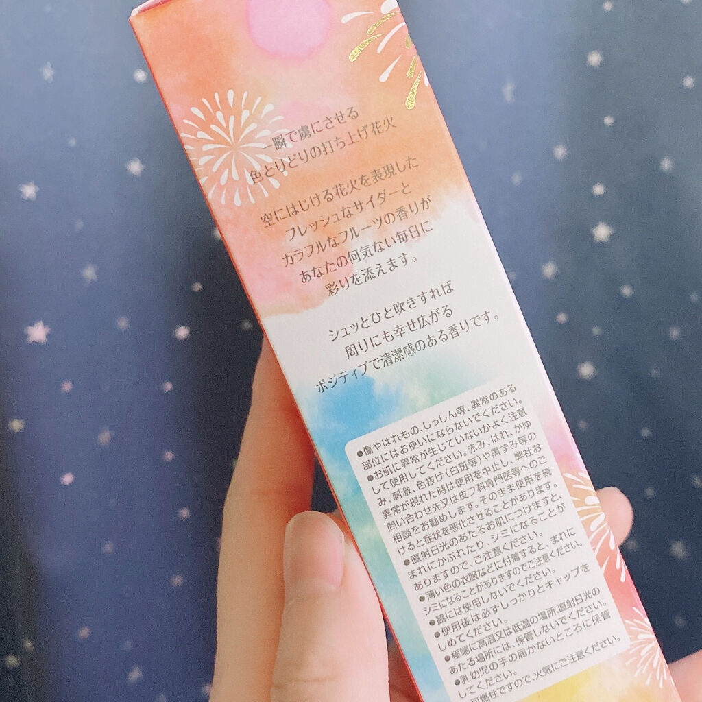 - 【数量限定】花火のようにはじける カラフルでフレッシュな香り。 空にはじける花火を表現した、フレッシュなサイダーとカラフルなフルーツの香りです。あなたの何気ない毎日に彩りを添える、ポジティブで清潔感のある香りです。 ●ペアーやラズベリーのジューシーな香りの中にフレッシュなサイダーが彩りを添えます。ミドルノートのミュゲやジャスミンが華やかに咲き、ラストはアンバーがやさしく香ります。