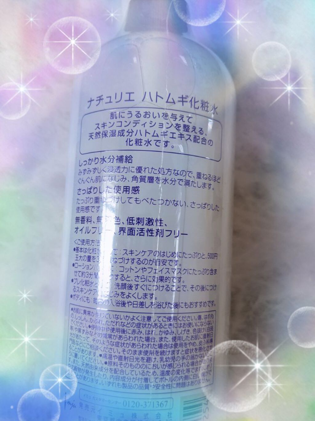 - <通常サイズ 500ml> 水、DPG、BG、グリセリン、ハトムギエキス、グリチルリチン酸2K、(スチレン/VP)コポリマー、クエン酸、クエン酸Na、メチルパラベン <500ml+ 限定ムーミンデザインボトル> 水、DPG、BG、グリセリン、ハトムギエキス、グリチルリチン酸2K、(スチレン/VP)コポリマー、クエン酸、クエン酸Na、メチルパラベン <詰め替えタイプ 480ml> 水、DPG、BG、グリセリン、ハトムギエキス、グリチルリチン酸2K、(スチレン/VP)コポリマー、クエン酸、クエン酸Na、メチルパラベン <旧製品> BG、グリセリン、メチルパラベン、エタノール、グリチルリチン酸2K、ハトムギエキス、DPG、クエン酸Na、プロピルパラベン、クエン酸、(スチレン/アクリレーツ)コポリマー、水 <限定ムーミンデザイン> 水、DPG、BG、グリセリン、ハトムギエキス、グリチルリチン酸2K、(スチレン/VP)コポリマー、クエン酸、クエン酸Na、メチルパラベン