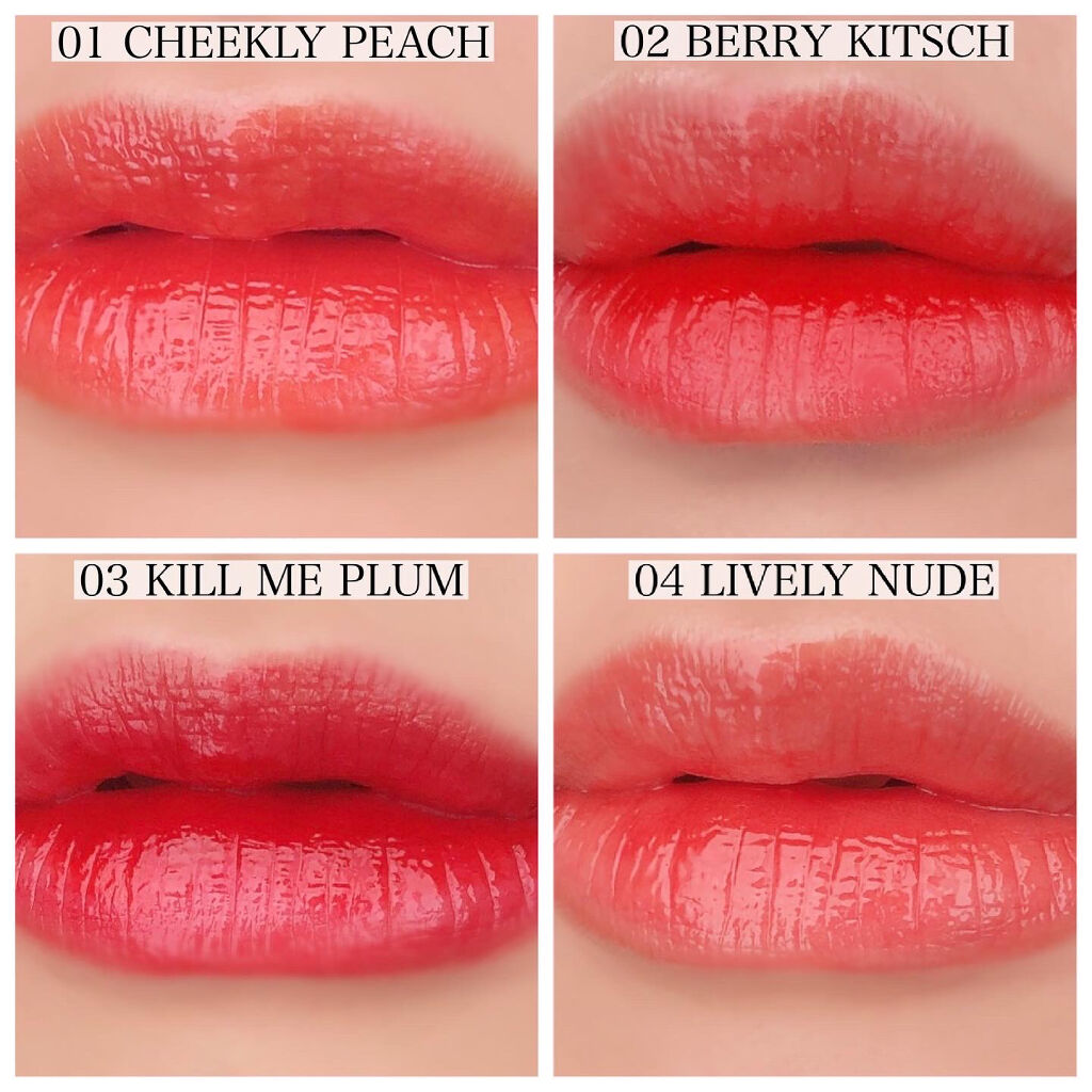 - <01 #Cheeky Peach> 水、ジフェニルジメチコン、ビスジグリセリルポリアシルアジペート-2、リンゴ酸ジイソステアリル、オクチルドデカノール、水添ポリイソブテン、グリセリン、ダイマージリノール酸ダイマージリノレイルビス(ベヘニル/イソステアリル/フィトステリル)、セチルPEG/PPG-10/1ジメチコン、DPG、イソステアリン酸ソルビタン、ポリソルベート60、ペンチレングリコール、ホホバ種子油、フェノキシエタノール、ヒアルロン酸Na、酸化チタン、ハチミツエキス、BG、スクワラン、(アクリル酸ヒドロキシエチル/アクリロイルジメチルタウリンNa)コポリマー、エチルヘキシルグリセリン、黄5、青1、黄4、赤104(1)、セテアレス-20、赤227、香料 <02 #Berry Kitsch> 水、ジフェニルジメチコン、ビスジグリセリルポリアシルアジペート-2、リンゴ酸ジイソステアリル、オクチルドデカノール、水添ポリイソブテン、ダイマージリノール酸ダイマージリノレイルビス(ベヘニル/イソステアリル/フィトステリル)、グリセリン、セチルPEG/PPG-10/1ジメチコン、DPG、イソステアリン酸ソルビタン、ポリソルベート60、ペンチレングリコール、ホホバ種子油、フェノキシエタノール、ヒアルロン酸Na、ハチミツエキス、BG、スクワラン、(アクリル酸ヒドロキシエチル/アクリロイルジメチルタウリンNa)コポリマー、エチルヘキシルグリセリン、黄5、青1、赤104(1)、セテアレス-20、赤227、香料 <03 #Kill Me Plum> 水、ジフェニルジメチコン、ビスジグリセリルポリアシルアジペート-2、リンゴ酸ジイソステアリル、オクチルドデカノール、水添ポリイソブテン、ダイマージリノール酸ダイマージリノレイルビス(ベヘニル/イソステアリル/フィトステリル)、グリセリン、セチルPEG/PPG-10/1ジメチコン、DPG、イソステアリン酸ソルビタン、ポリソルベート60、ペンチレングリコール、ホホバ種子油、フェノキシエタノール、ヒアルロン酸Na、ハチミツエキス、BG、スクワラン、(アクリル酸ヒドロキシエチル/アクリロイルジメチルタウリンNa)コポリマー、エチルヘキシルグリセリン、黄5、青1、黄4、セテアレス-20、赤227、香料 <04 #Lively Nude> 水、ジフェニルジメチコン、ビスジグリセリルポリアシルアジペート-2、リンゴ酸ジイソステアリル、オクチルドデカノール、水添ポリイソブテン、ダイマージリノール酸ダイマージリノレイルビス(ベヘニル/イソステアリル/フィトステリル)、グリセリン、セチルPEG/PPG-10/1ジメチコン、DPG、イソステアリン酸ソルビタン、ポリソルベート60、ペンチレングリコール、ホホバ種子油、フェノキシエタノール、ヒアルロン酸Na、酸化チタン、ハチミツエキス、BG、スクワラン、(アクリル酸ヒドロキシエチル/アクリロイルジメチルタウリンNa)コポリマー、エチルヘキシルグリセリン、黄5、青1、黄4、赤104(1)、セテアレス-20、赤227、香料