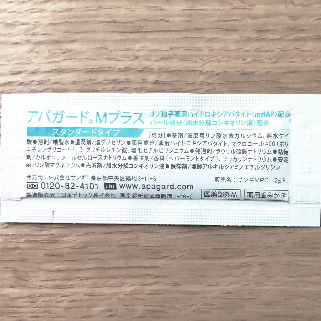 - ●基剤/歯磨用リン酸水素カルシウム、無水ケイ酸●溶剤/精製水 ●湿潤剤/濃グリセリン●薬用成分/薬用ハイドロキシアパタイト、マクロゴール400(ポリエチレングリコール)、β-グリチルレチン酸、塩化セチルピリジニウム●発泡剤/ラウリル硫酸ナトリウム●粘結剤/カルボキシメチルセルロースナトリウム●香味剤/香料(ペパーミントタイプ)、サッカリンナトリウム●安定剤/リン酸マグネシウム●光沢剤/加水分解コンキオリン液●保存剤/塩酸アルキルジアミノエチルグリシン液
