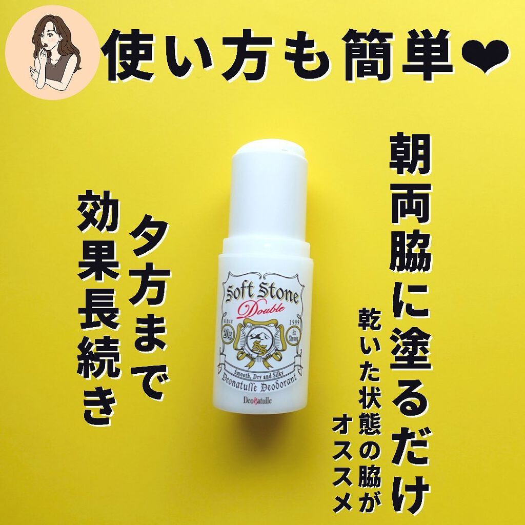 - \11年間ず~っと売上No.1*制汗デオドラント/ ワキの汗・ニオイを元から防ぐ 直ヌリスティック・無香料・アルコールフリー 天然アルム石に着目。有効成分「焼ミョウバン」を配合。 ◆◆ユーザーから選ばれる理由◆◆ ◆『天然アルム石のチカラ』に着目して、汗・ニオイを元から防ぐ! 「デオナチュレ ソフトストーンW」は、天然アルム石に着目。有効成分「焼ミョウバン」を配合し、汗・ニオイを元から防ぎます。 ◆ニオイの発生源・ワキに“直ヌリ”でしっかり密着し、朝ぬって夜まで続いちゃう! 忙しい朝でもサッとつけることができるスティックタイプで、夜まで長時間持続。 ◆すぐにサラサラ!ベタつき・白残りしにくい すぐに洋服を着ることができるので、時間のない朝にも嬉しい! ==注意== ●顔・粘膜を避け、除脱毛直後や肌に異常があるときは使用しないでください。●肌に異常が生じていないかよく注意してご使用ください。また、お肌に合わないとき、使用中に赤み、はれ、かゆみ、刺激、色抜け(白班等)や黒ずみ等の異常があらわれたときは、使用を中止し、皮フ科専門医などにご相談ください。●使用後はキャップをしっかり閉め、直射日光や高温多湿を避けて保管してください。●乳幼児の手の届かないところに置いてください。●スティックを出し過ぎて折れないようご注意ください。●衣類などにつかないようご注意ください。●本製品は残り少なくなりますと、構造上容器の底に中身が若干残ります。そのため、実際には容器に表記されております容量以上を充填しております。 販売名:DN薬用スティックFe *インテージSRI+制汗剤市場 2013年5月~2024年4月 ソフトストーンW(販売名:デオナチュレソフトストーンEX(リニューアル前処方)・DN薬用スティックFe)累計販売金額