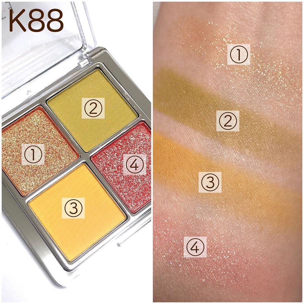 - 捨て色なし!マットxラメxシアーで作る立体アイ 肌なじみの良いベースカラーとハイライト、締め色を組み合わせた4カラーアイシャドウパレット。 高発色で粉飛びしにくく、指先でつけてもチップでつけてもOK。 ・小型で持ち運び可能で、日常の使用に対応 ・くすみにくく長時間ツヤめく目元を実現 ・肌なじみが良く鮮やかな発色で、洗練された大人の目元を演出