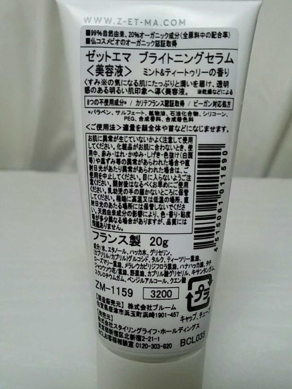 - 2021年3月1日よりメイクアップキッチンにて発売中 フランス発のオーガニックコスメ「Z&MA」から、気になるくすみ*1をケアするブライトニング美容液が登場。 ・みずみずしいジェルセラムが肌*2のすみずみまでたっぷりと潤いを届け、 透明感のある明るい肌へ導きます。 ・99%自然由来 ニアウリ精油(メラレウカビリジフロラ葉油)【皮脂分泌調整作用】/ローズマリー精油(ローズマリー葉油)【毛穴引き締め作用】/ミントエキス(ハッカ水)【リフレッシュ作用、透明感アップ】 ・20%オーガニック原料(全原料中の配合率) ・8つの不使用成分 パラベン、サルフェート、鉱物油、石油化合物、シリコーン、PEG、合成香料、合成着色料 ・ビーガン対応処方/クルエルティフリー ・ミント&ティートゥリーの香り ・仏コスメビオ認証オーガニック取得/カリテフランス認証取得 *1 乾燥による *2 角質層