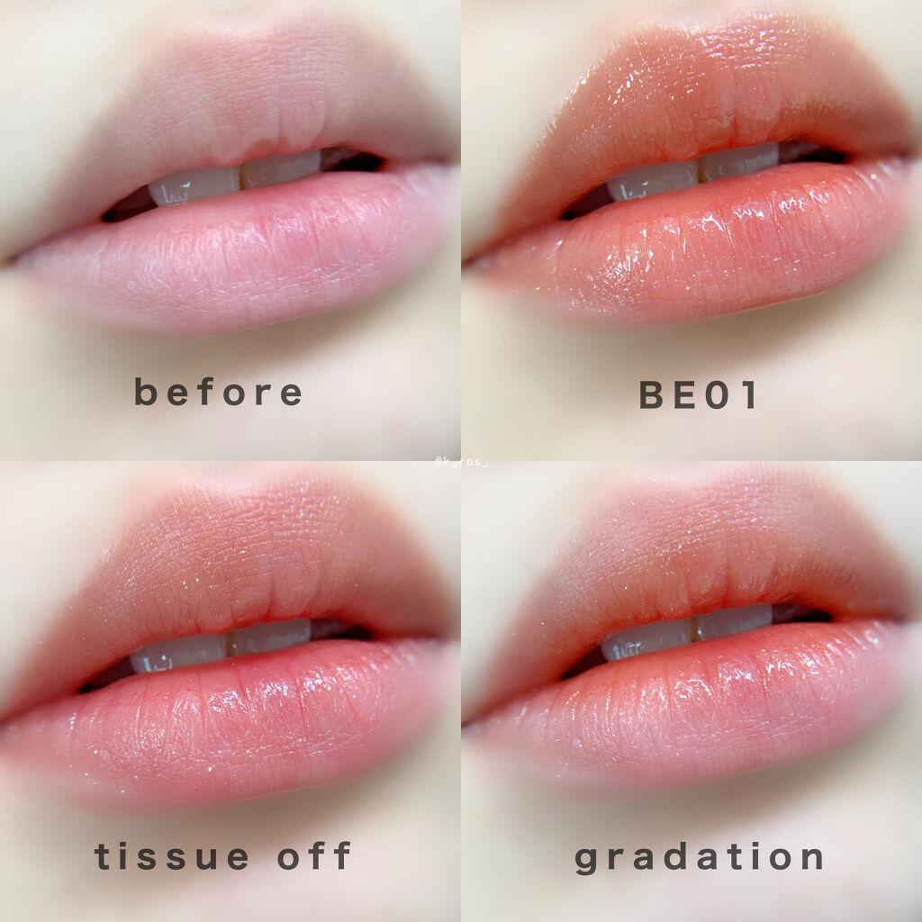 ラメがめちゃくちゃ可愛いA’pieuのジューシーパン スパークリングティント。BE01のときめくイチジクはベースがベージュ系のナチュラルカラーでゴールドやホワイト系のラメが入っています! 普段から濃いめのリップが好きな方は物足りないと感じると思うので、こちらを全体的に塗った上に内側に濃いめのリップ塗ってもとても可愛く仕上がります🫶🏻 ティント効果もあって、ティッシュオフするとツヤ感は失われるものの色とラメはしっかり残ります!
