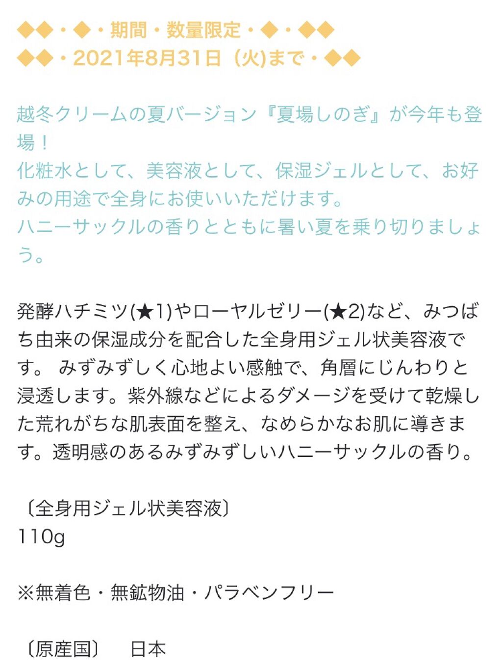 みずみずしく心地よい感触で、角質にじんわりと浸透し、 紫外線などのダメージを受けた肌表面を整え、 乾燥による肌荒れを防ぎ、なめらかな肌に導きます。 ジム&旅行用に使おうと、張り切って店舗に行ったら こちらは販売されている店舗が限られているとのこと。 ジェル状の全身美容液で すっと肌に馴染み、べたべたしません! そのまま服着れるし、スマホ触れるし、 素晴らしいテクスチャー!