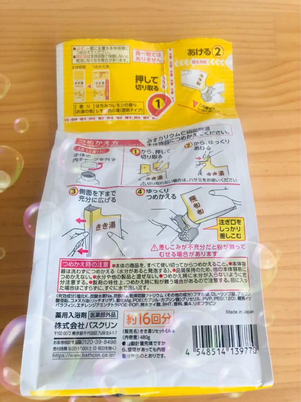 温泉ミネラル+炭酸ガスが温浴効果を高め、日常生活の様々な身体の症状を、その日のうちに緩和する入浴剤。 温泉ミネラル増量(従来品比)。温泉ミネラル+炭酸ガスが、温浴効果を高めて血行と新陳代謝を促進し、からだを芯まで温め、身体の諸症状を緩和します。 はちみつレモンの香り。レモン色の湯(透明タイプ)