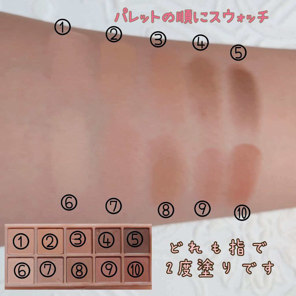 ブルベ向けヌードパレットというだけあって、上の段のピンクも下の段のブラウンも優しい発色。 粉質はサラッサラです。 サラサラですが密着はしっかりしてくれるので、色持ちは悪くないです。 優しくふわっと仕上げたいときにぴったりのパレット。