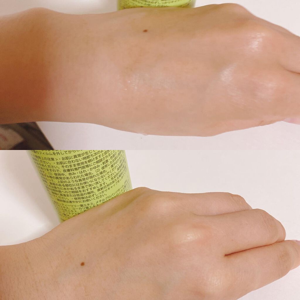 - 全成分:ティーツリー葉エキス、メチルプロパンジオール、DPG、ツボクサエキス、ユーカリ葉エキス、アロエフェロックス葉エキス、アルニカ花エキス、ニガヨモギエキス、セイヨウノコギリソウエキス、ゲンチアナ根エキス、トレハロース、ベタイン、グリチルリチン酸2K、グリセリン、PEG-60水添ヒマシ油、EDTA-2Na、ヒドロキシアセトフェノン、香料