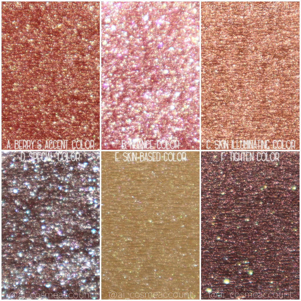 S[SHINY]“高輝度ガラスパール×カラーパールの美しいきらめき”↓S01.ピュアブロンズ“上品に艶めくブロンズゴールド” R[RICH]“リッチな高発色と繊細なツヤで色遊びを楽しめる”↓R01.バニラムスク“光を集めるハイライトベージュ” F[FLUFFY]“ふんわり・しっとりの新感覚 肌と同化するセミマット”↓F01.ラストナイト“血色感を潜ませるメロウなピンク”