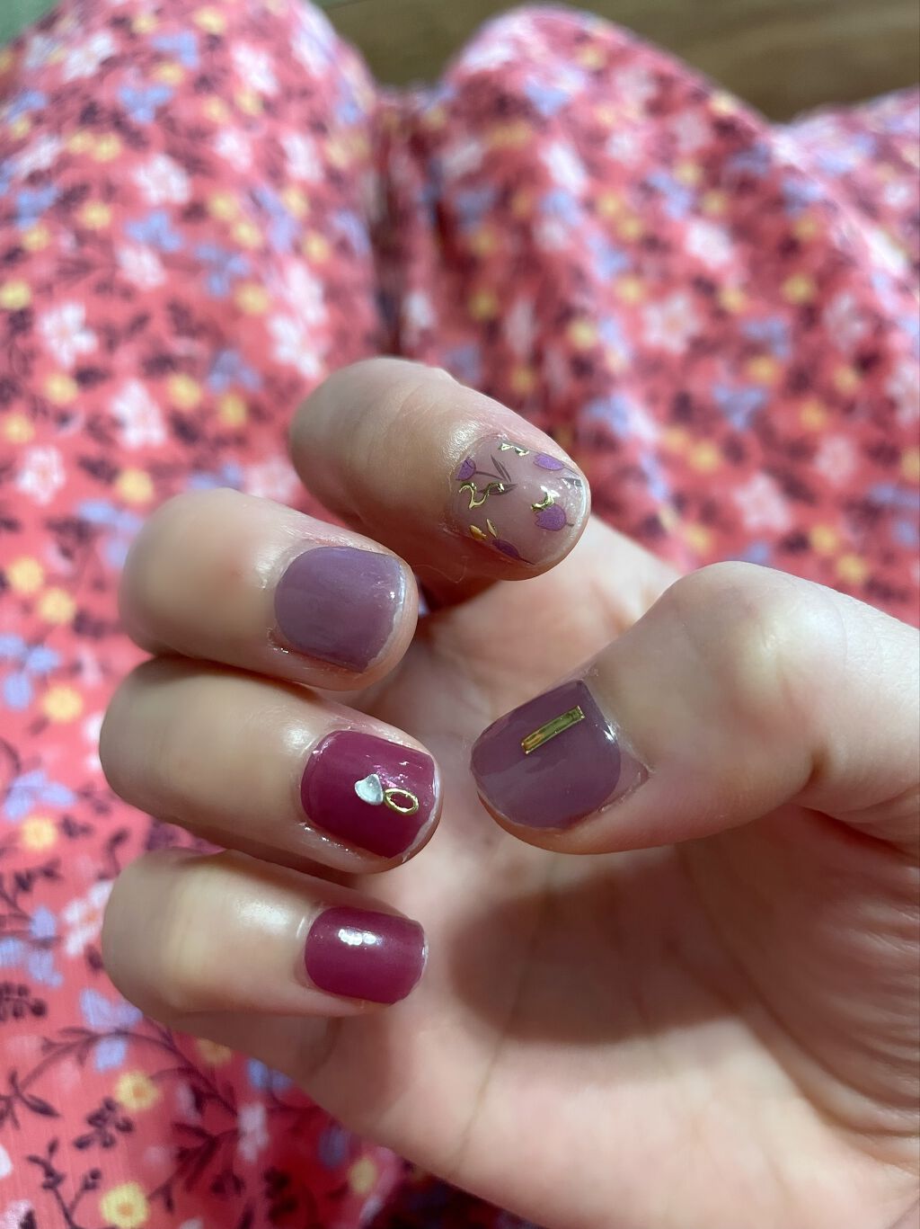 可愛い押し花風のネイルが出来ました⋆꙳ 小花が可愛く、色もピンクと紫という可愛らしい感じでお気に入り💕 今回も仕上げにセリアのクリアジェルで仕上げてぷっくり長持ちになりました🥰