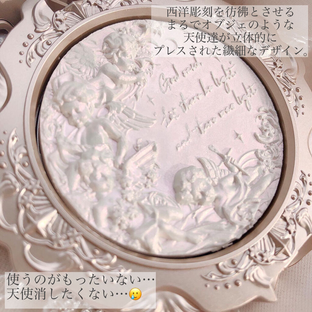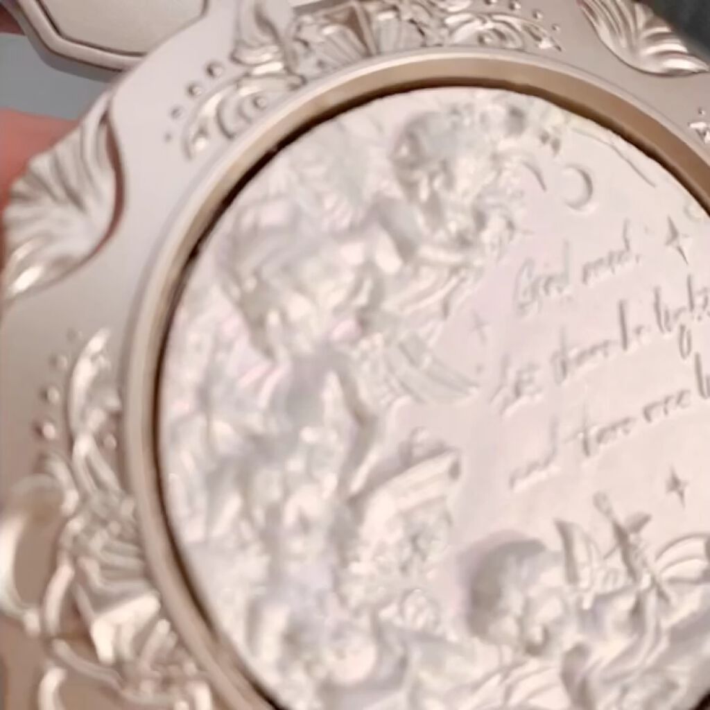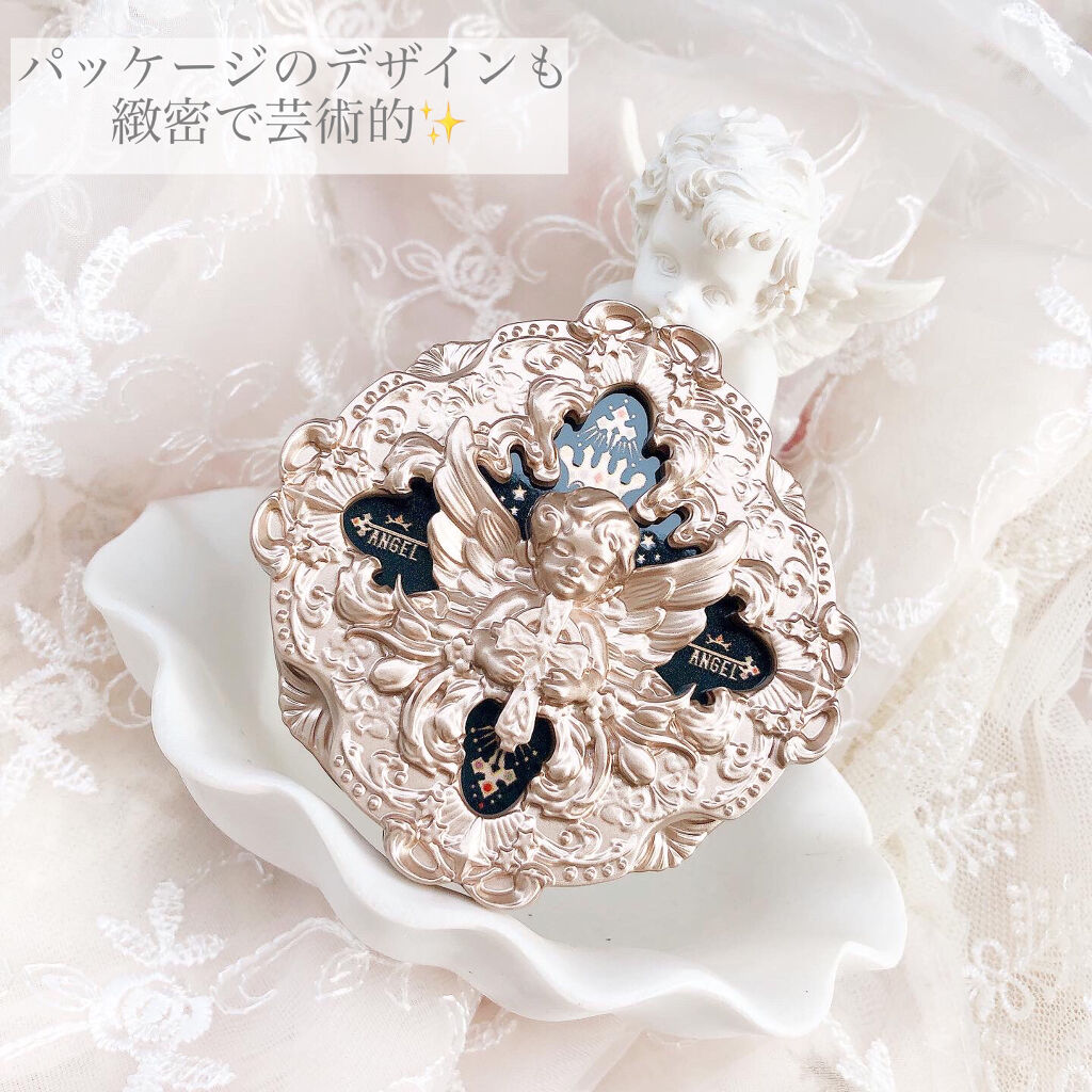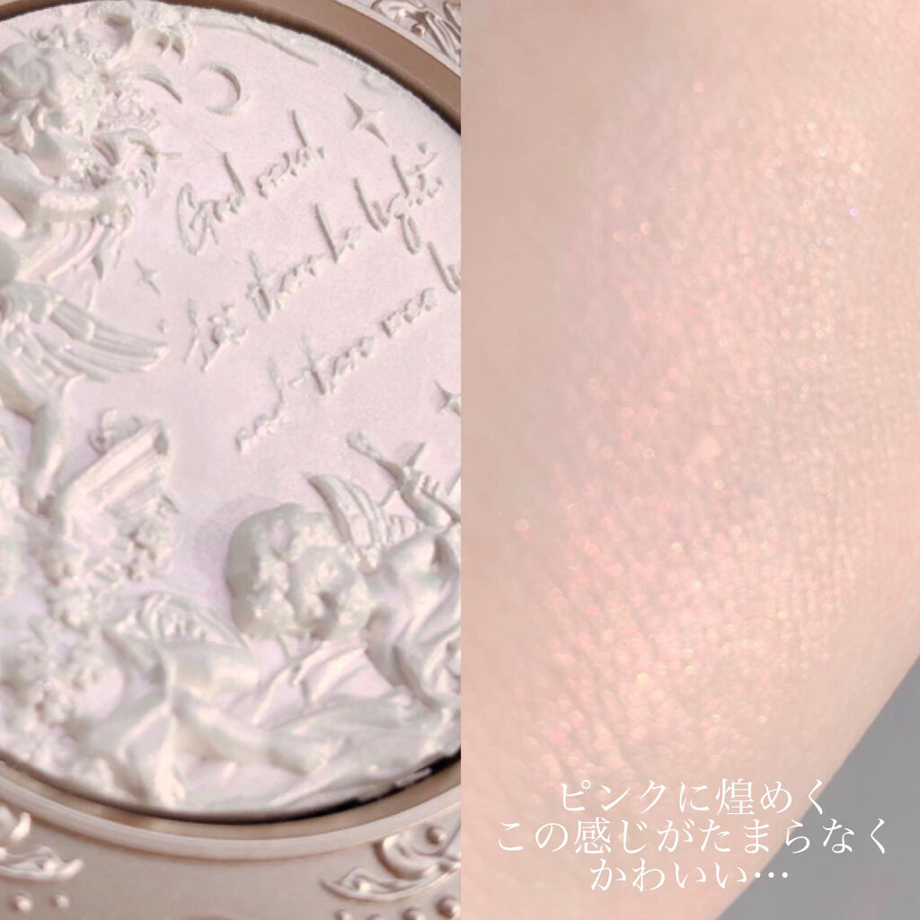 シャンパンピンクをベースにしたハイライター。パッケージデザインはステンドグラスの前で祈る天使を描いた美しいコンパクトで、中のパウダーにも西洋神話をモチーフにした繊細な彫刻が施されている。 まず見た目が可愛すぎる😍ギラギラしすぎなくてすごく使いやすいし、肌なじみのいい色味で変な光り方しないからハイライター初心者(私)にぴったりかも😳 なにより使っててテンション上がるところが高ポイント💡オススメです🙌