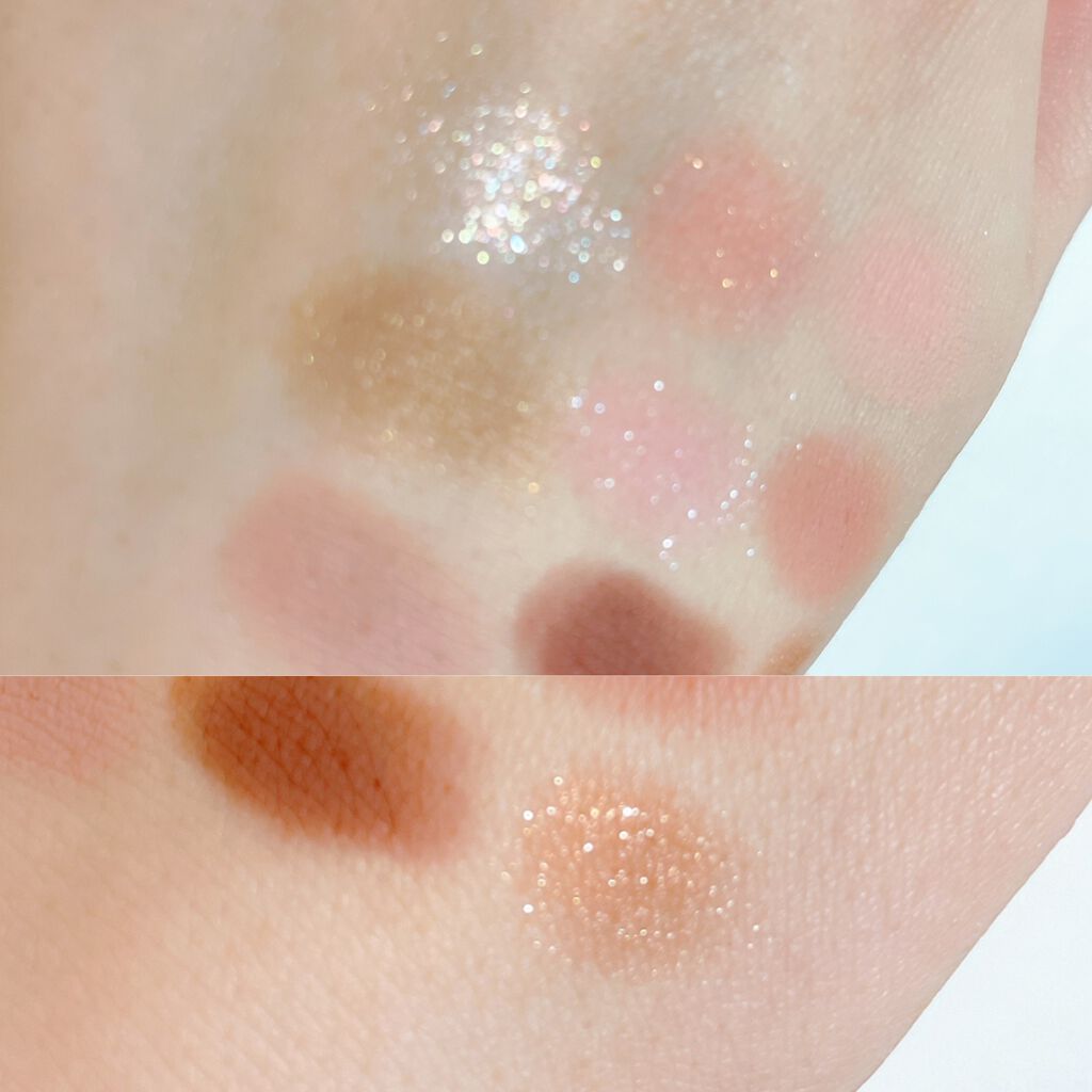 全色可愛い(全体的に秋っぽいカラーで上品でおしゃれに✨) ラメ感も細かくとてもきれい🥰 ピンクメイクはもちろん、オレンジメイクやブラウンメイクにもぴったりなパレットだと思いました!!(。-.-。)♡ 真ん中のピンクの色が1番好き…♡(表現ができないふんわりとしたピンクが最高) アイシャドウだけではなく、チークやアイブロウなどにも使える…万能すぎ…!!