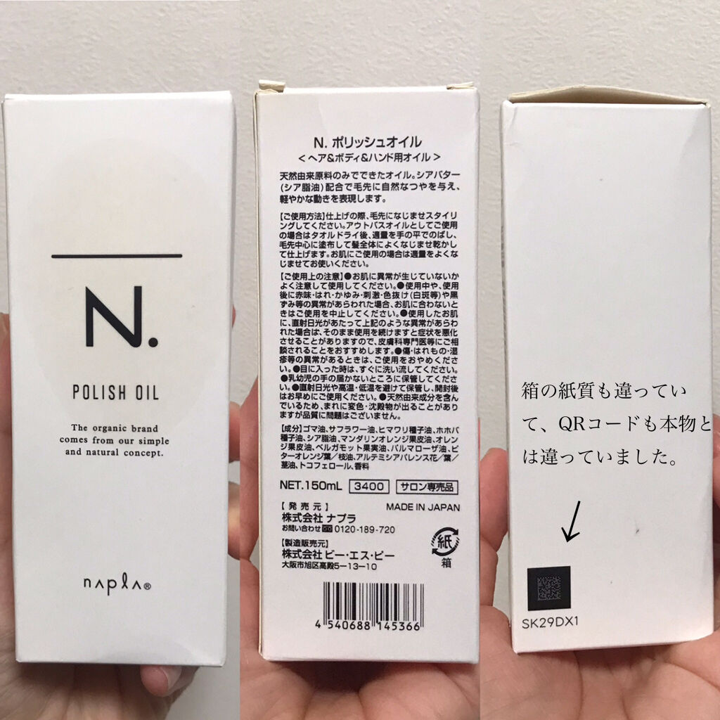 N.のオイル結構お値段するから、お安く買えると思うとついつい勢いでやっちゃうよね😭 シールに記載されてる内容なんか一言一句同じで、初めて買う人なら分からへんかもやね?🙄💦 いつも思うけど、ここまで精巧な偽物作る技術があるならオリジナルの良い物作ればいいのに…😅