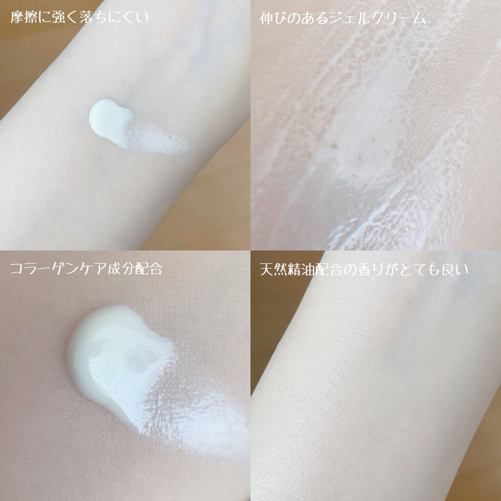- 「汗・水」「摩擦」に強く、落ちにくい。 一日中うるおい続く、高UVカットジェルクリーム。 SPF50+・PA++++(顔・からだ用) 〇 日常のこすれ・摩擦に強く落ちにくい機能フリクションプルーフ。 〇 汗・水に抜群に強い機能スーパーウォータープルーフ*1。 〇 みずみすしいウォーターベース処方。 〇 紫外線などによる乾燥ダメージを防ぎ、みずみずしくうるおったなめらかなハリ肌に整えます。 〇 コラーゲンケア成分配合(保湿:水溶性コラーゲン、グリセリン、グリシン、プロリン、アラニン、加水分解シルク)。 〇 天然精油配合のリラックス感のある香り。