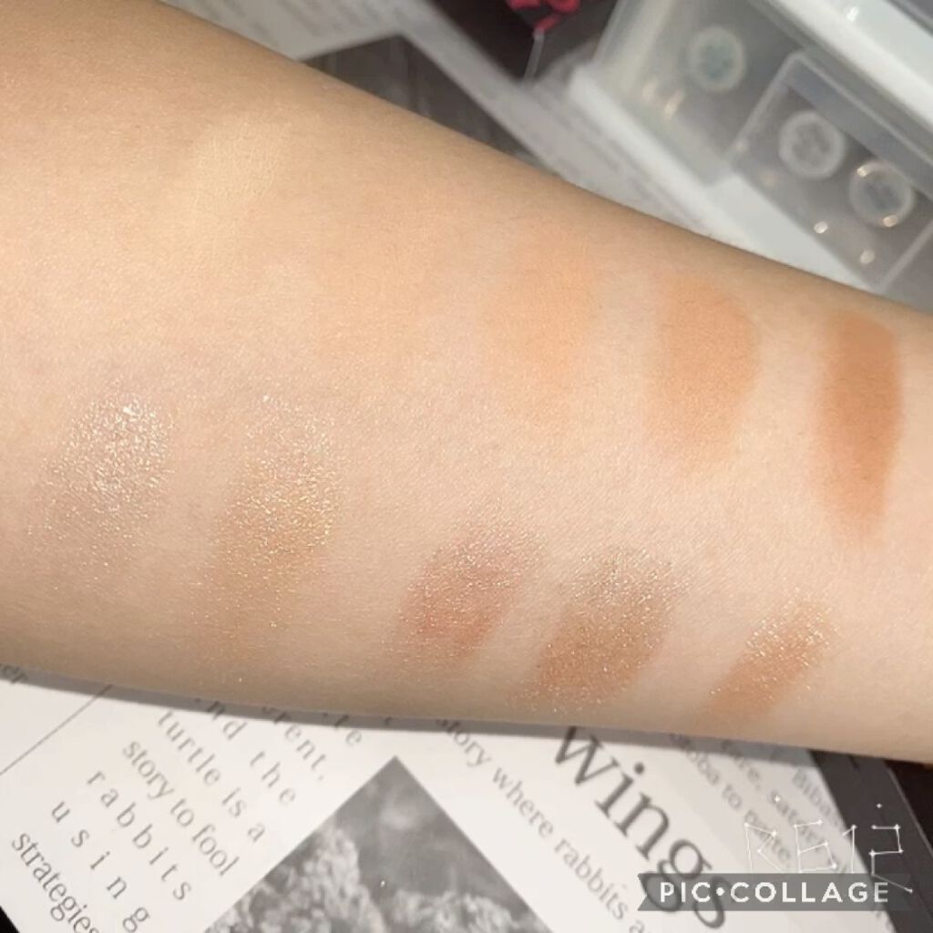 マットだけどどこかツヤ感もあるような柔らかい粉質……なのに粉飛びも少なめなので 瞼に乗せやすい🥰 5番のラメ感は控えめ。 シャンパンカラーに多色ラメがチラッ|˙꒳˙)✨ 実はこの番号通りにカラーを使うとプロ並みのメイクが完成するらしいです……‼️ ケースも薄くてコンパクトなのにベースカラー、ラメ、締め色、チークまで付いてるので 持ち運びやいつか行けるようになるであろう旅行などにも良さそうです❣️