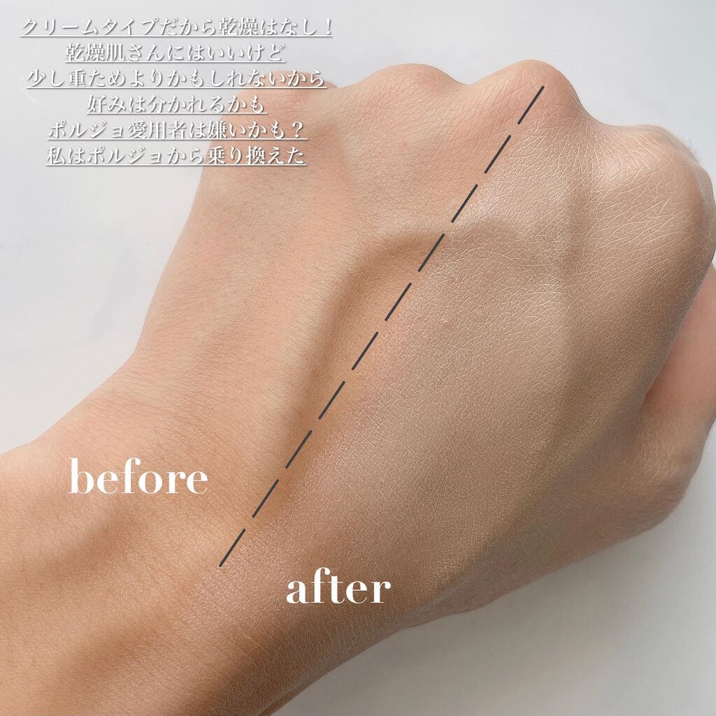 まるで素肌が綺麗な人のように仕上がるので、とても気に入ってます。 トーンアップの仕方が自然だし、ヨレずにピタッと密着して綺麗な仕上がりです。 この上にパウダーだけでもいいし、しっかりメイク感が欲しい時はファンデーションを重ねて使用しています。