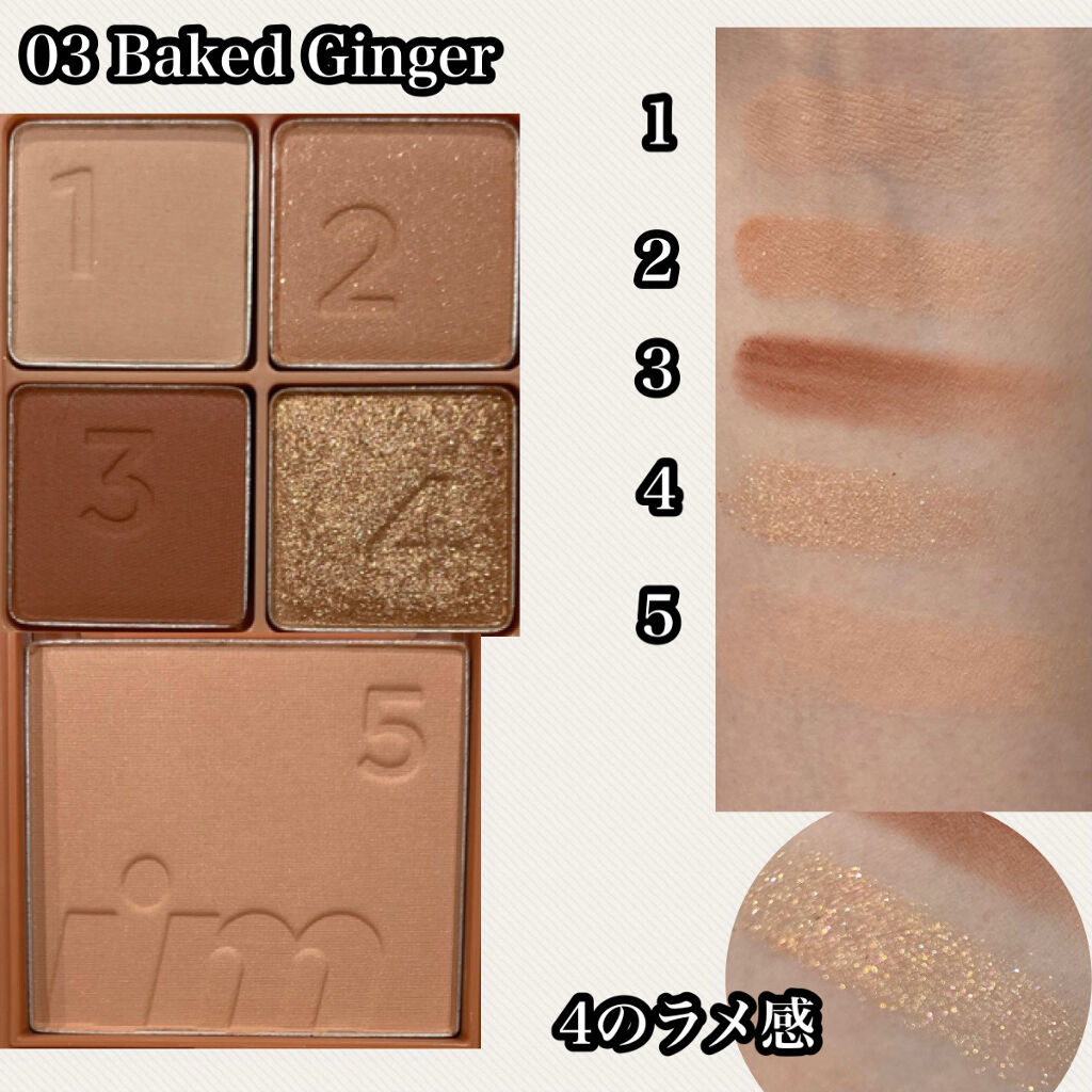 【#アイムミミ#i’mmeme】#マルチキューブ#03#ベイクドジンジャー番号通りにメイクするだけ!とっても簡単にメイクが仕上がるアイシャドウ&チークです!1-4がアイシャドウ、5がチークになっています。粉質はサラッとした粉質で、テクニックレ...
