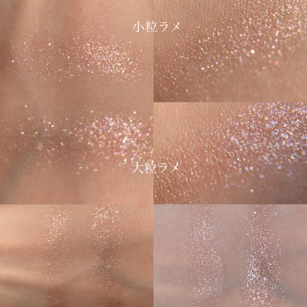 - ベース色が発色せずに、ラメだけをのせられるアイシャドウ。小粒と大粒のラメで、どんなメイクも理想の輝きに調節。「アイシャドウの上に重ねる」「アイシャドウの下に仕込む」「単品で使う」など、お好みで使えます。
